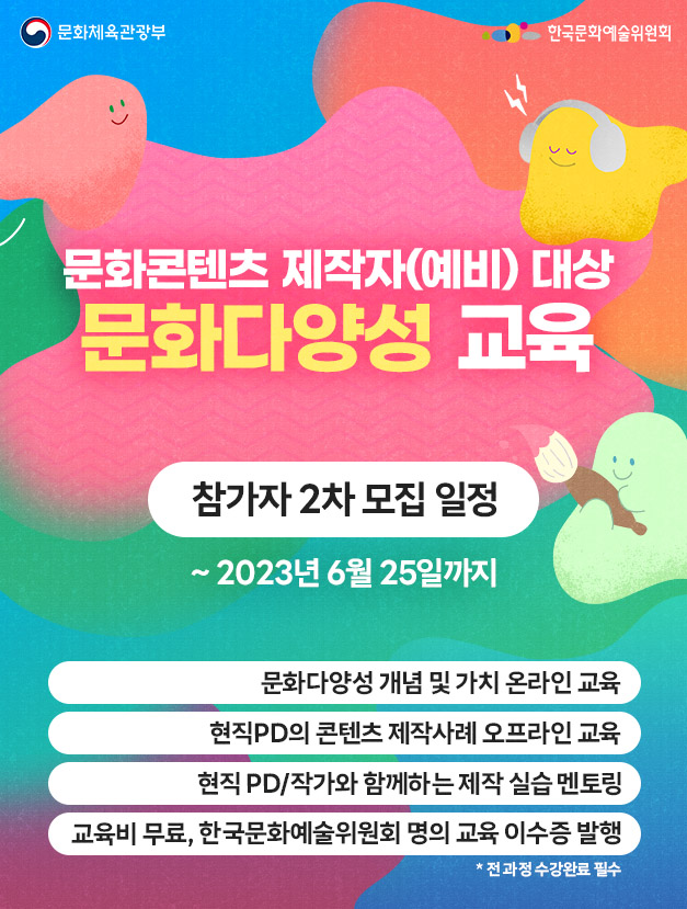 Q6. 문화다양성에 대해 아무것도 모르는데 신청해도 되나요? A6. 네, 가능합니다. 3단계 교육을 통해 문화다양성의 개념·정책·영역 이해부터 현직 방송사 PD의 실제 콘텐츠 제작 사례를 통한 실무적 이해 후, 현직 제작사 PD/작가 5인과의 3회차 제작실습 멘토링 통해 실제 영상 콘텐츠를 제작하며 콘텐츠 제작자가 가져야 할 문화다양성 역량을 키울 수 있습니다.