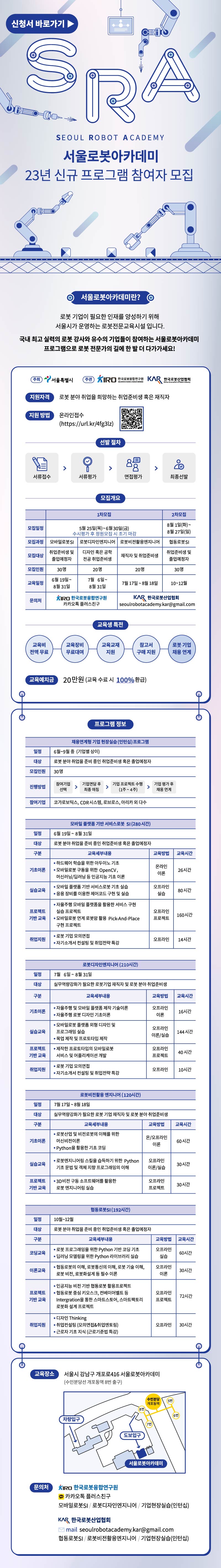 단계별 프로젝트로 누구나 참여 가능한 서울로봇아카데미와 함께하세요👨 💻 👉신청링크 바로가기 https://url.kr/4fg3lz ✅모집 대상 - 로봇분야에 관심있는 누구나! ✅모집 과정 - 모바일로봇 SI(30명)\, 로봇디자인 엔지니어(20명)\, 로봇비전 활용엔지니어(20명), 협동로봇SI(30명), 기업 현장실습 프로그램(30명) ✅기간 및 일정 - 1차 모집 : 5월 25일(목) \~ 6월 30일(화) *수시평가 후 정원모집 조기마감 - 2차 모집 : 8월 1일(화) \~ 8월 27일(일) ✅교육 참여 방법 - 선착순 문의 ✅교육 혜택 - 교육비 전액 지원\, 로봇기업 인턴십\, 로봇장비 무료대여\, 취업연계 프로그램 무한 지원 ✅문의 - 카카오톡 오픈채팅방 '한국로봇융합연구원' 검색
