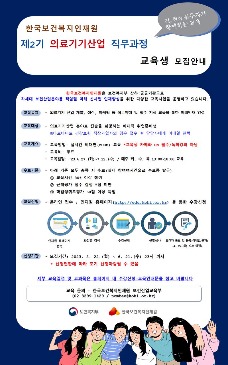 1. 교육목적 - 의료기기산업 분야 직무교육을 통한 필수지식 습득 및 취업경쟁력 강화 - 전주기(개발\, 생산\, 마케팅) 통합 교육을 통한 실무형 인재양성 및 일자리 연계지원강화 2. 교육대상 : 의료기기 산업 분야로 진출을 희망하는 취업준비생 또는 교육에 관심을 가진 분들! 누구나!! 3. 교육일정 : ‘23. 6. 27. (화)\~ 7. 12. (수) 매주 화, 수, 목, 13:00\~18:00 - 교육시간 총 40시간 - 비대면 라이브 교육(ZOOM) 4. 교육비용 : 무료 5. 유의사항 - 이수기준(출결 80%이상\, 근태평가 감점 5점 미만\, 학업성취도 평가 60점 이상) -인재원 규정상 수료증에는 결강시간 차감 후 수료증 발급 * 자세한 내용은 첨부파일 확인 부탁드립니다.