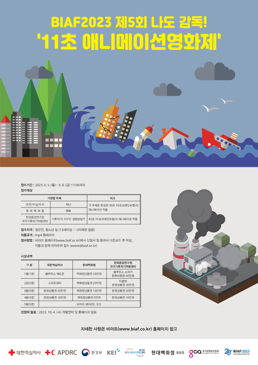 ■ 시상일정 : 2023. 10. 21.(토) 11:00 한국만화박물관 1층 상영관 ■ 상영일정 : 2023. 10. 21.(토) 12:00\~ 한국만화박물관 1층 상영관 ■ 출품기간 : 2023. 6. 5.(월) \~ 9. 8.(금) 17:00까지 ■ 출품대상 - 대한적십자사: ‘재난’ 주제로 완성된 40초 이내(크레딧 포함)의 애니메이션 작품 - 현대백화점: ‘행복(기쁨, 사랑, 감사와 같은 수많은 긍정적 정서의 총합. 즐거운 느낌, 새로운 영감, 가치의 발견을 통해 느끼는 행복)’ 주제로 완성된 40초 이내(크레딧 포함)의 애니메이션 작품 - 한국환경연구원: ‘기후위기! 지구인 생존방법?!(기후위기에 적응한 모습 또는 중요성을 담은 영상)’ 주제로 완성된 60초 이내(크레딧 포함)의 애니메이션 작품 ■ 출품자격 : 일반인, 청소년 등 (13세이상 \~ 나이제한 없음) ■ 출품규격 : mp4 플레이어 ■ 출품방법 : 비아프 홈페이지 (www.biaf.or.kr) 신청서(동의서 포함) 다운로드 후, 작품과함께 전자우편 접수 (event@biaf.or.kr) ■ 시상내역 - 1등(각 주제당 1명) * <대한적십자사> : 블루투스 헤드폰 * <현대백화점> : 백화점상품권 50만원 * <한국환경연구원> : 블루투스 스피커, 문화상품권 40만원 - 2등(각 주제당 2명) * <대한적십자사> : 스마트워치 * <현대백화점> : 백화점상품권 25만원 * <한국환경연구원> : 타블렛, 문화상품권 30만원 - 3등(각 주제당 3명) * <대한적십자사> : 문화상품권 20만원 * <현대백화점> : 백화점상품권 10만원 * <한국환경연구원> : 문화상품권 20만원 - 4등(각 주제당 4명) * <대한적십자사> : 문화상품권 10만원 * <현대백화점> : 백화점상품권 5만원 * <한국환경연구원> : 문화상품권 10만원 - 5등(각 주제당 5명) * <대한적십자사> : BIAF 배지, 굿즈 * <현대백화점> : BIAF 배지, 굿즈 * <한국환경연구원> : BIAF 배지, 굿즈 ■ 심사 방법 - 심사일시 : 2023. 9. 18.(월) \~ 9. 22.(금) - 심사기준 : 완성도(50%), 독창성 및 창의성(20%), 대중 친화성 (30%) ■ 선정작 발표 : 2023. 10. 4.(수) 개별연락 및 홈페이지 발표 ■ 기타사항 - 출품작은 본인의 창작물이어야 하며, 접수 취지에 적합하지 않은 작품은 심사대상에서 제외합니다. - 선정 작품은 BIAF조직위원회 및 대한적십자사, 현대백화점 중동점, 한국환경연구원의 홍보자료로 활용할 수 있습니다. - 심사내용은 공개하지 않습니다. ※ 문의사항_부천국제애니메이션페스티벌(BIAF)사무국 : 032-325-2061\~2