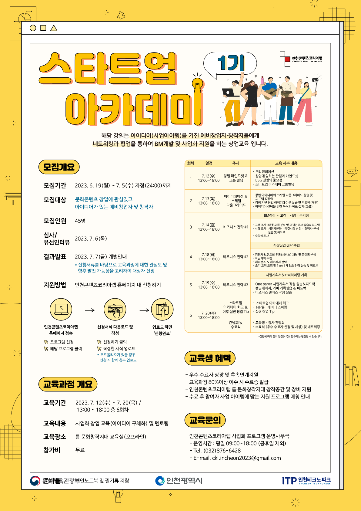 ▶ 모집기간 : 2023. 06. 19. (금) \~ 07. 05. (금) 자정까지 ▶ 모집대상 : 문화콘텐츠 창업에 관심있고 아이디어가 있는 예비창업자 및 창작자 ▶ 모집인원 : 45명 ▶ 신청하기 : 인천콘텐츠코리아랩 홈페이지 내 프로그램 신청 > '2023 스타트업 아카데미 1기 모집 (창업지원)' 클릭 > 신청서식 다운로드 및 작성 > 업로드 하면 '신청완료' ○혜택 - 우수 수료자 상장 및 후속연계 지원 - 교육과정 80% 이상 이수 시 수료증 발급 - 인천콘텐츠코리아랩 틈 문화창작지대 창작공간 및 장비 지원 - 수료 후 참여자 사업 아이템에 맞는 지원 프로그램 매칭 안내 ▶ 교육문의 : 인천콘텐츠코리아랩 사업화 프로그램 운영사무국 Tel.) 032-876-6428 E-mail) ckl.incheon2023@gmail.com