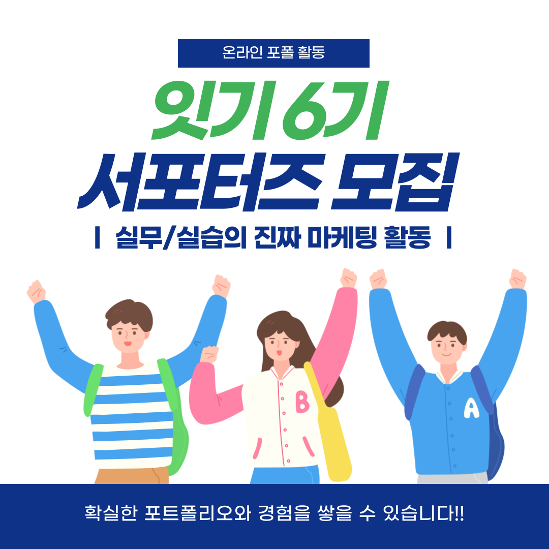 서포터즈 여러분들과 함께 잇기를 마케팅하고자 합니다. 그 어떤 대외활동 보다도 가장 보람차고 의미가 있는 활동을 남겨드리겠습니다! 잇기와 [진짜 마케팅]을 함께 해보실 분들을 구합니다. ● 잇기 서포터즈만의 특징 1. 여러분들의 의견이 많이 반영되는 활동이 될 것 입니다. 2. 마케팅 멘토링이 함께 진행됩니다. 3. 결과가 좋다면 그에 따른 보상도 주어집니다. 4. 마케팅 이론과 실전을 함께 해보는 활동이 이뤄집니다. 5. 모든 활동은 온라인으로 진행됩니다. ● 이런분들 신청해 주시면 좋아요 1. 마케팅 직군을 꿈꾸며 경험해 보고 싶으신 분 2. 온&오프라인 마케팅 활동에 열려 있으신 분 3. SNS활동이 활발하신 분 4. 서포터즈 팀활동에 있어 시간적 여유가 있으신 분 ● 모집인원 1. 총 40명 ● 일정 1. 모집기간 : 06/30 까지 2. 모집결과 발표일자 : 07/05 오후 4시 3. 오리엔테이션 : 07/08 오후 12:00 4. 활동기간 : 07/08 \~ 09/01 (7주) ● 이런 활동을 합니다 1. 잇기 브랜드 마케팅 활동 2. 마케팅 콘텐츠 제작활동 3. 관심사가 맞는 동료들과 팀 활동 4. 실무와 유사한 회의 및 KPI - 이전 서포터즈 활동기록 : https://url.kr/1atwkj ● 혜택 1. 서포터즈 활동 수료증 지급 2. 팀단위 프로젝트 경험 3. 성과에 따른 인센티브 지급 4. 실무와 유사한 시스템 경험 5. 잇기회원 혜택 적용 ● 신청링크 https://forms.gle/sf9Guy7aRwQmszCM7 ●문의 1) 잇기 소개 : https://url.kr/89i7wx 2) 카톡 : https://open.kakao.com/me/Creatorsong