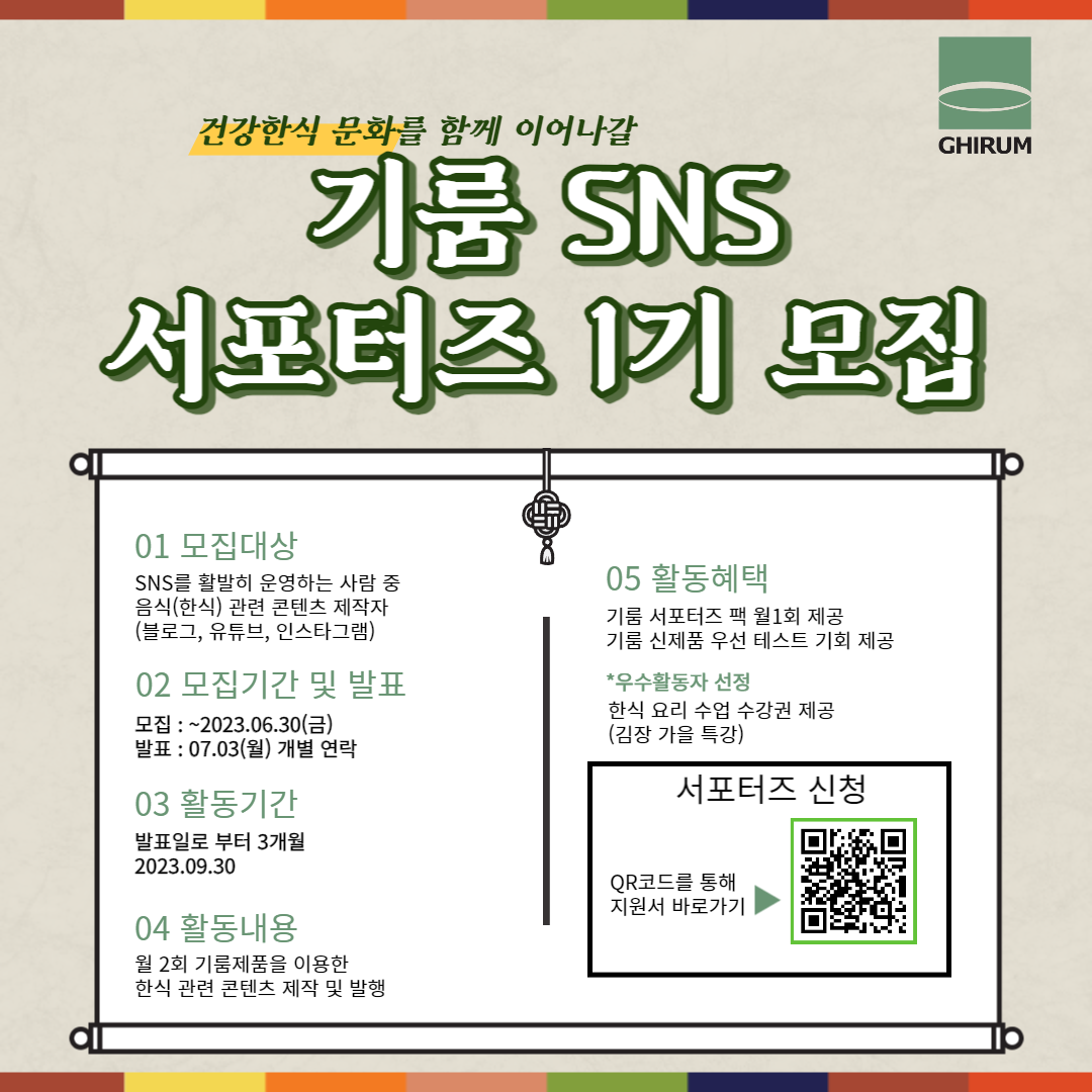 건강한식문화를 전파할 기룸 온라인 SNS서포터즈 1기 모집 ■ 기룸 둘러보기 http://ghirum.co.kr/