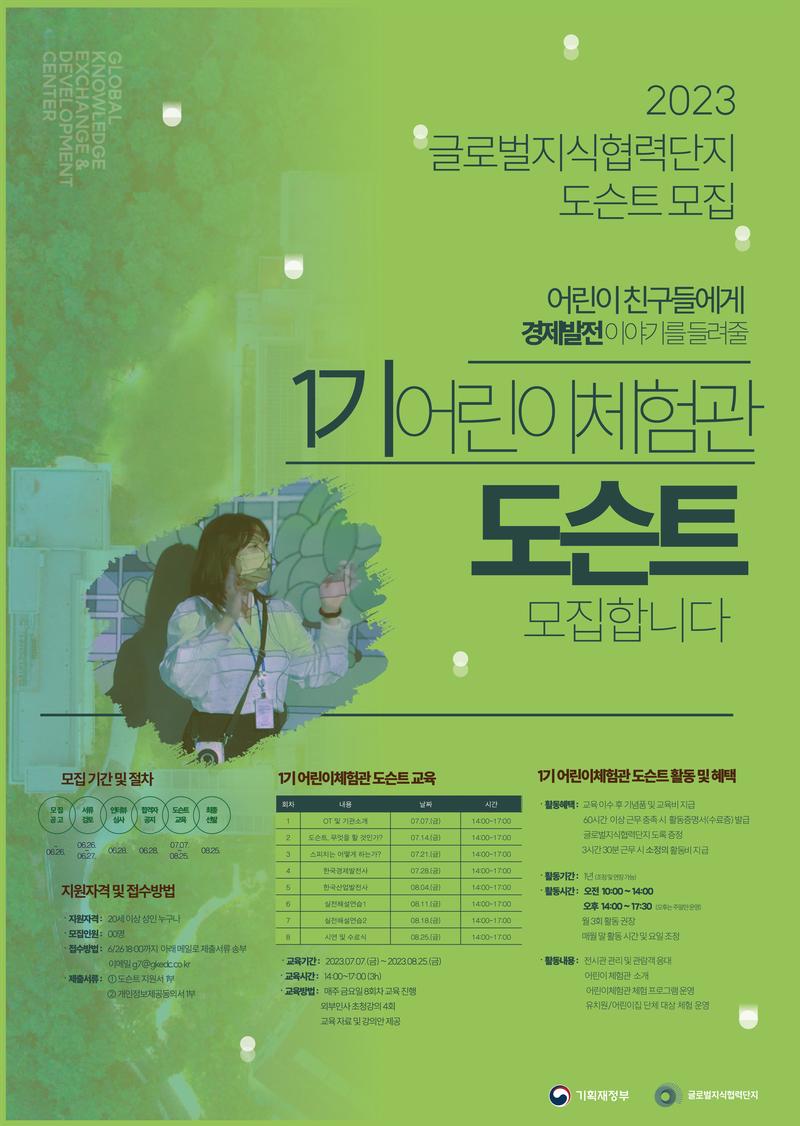 ■ 접수방법 : 신청기간 내 이메일 접수만 가능 (이메일 : g7@gkedc.co.kr) * 파일명 : 1기 어린이체험관 도슨트 지원_홍길동 ※반드시 한글(hwp) 형식으로 제출 * 이메일 제목 : [1기 어린이체험관 도슨트 지원]_홍길동 * 자세한 내용 및 첨부파일 : 하단 글로벌지식협력단지 공식 블로그 링크 참고https://blog.naver.com/gkedcenter/223127838172 ■ 문의 : 전시교육운영실 변혜린 연구원 02-6312-4111