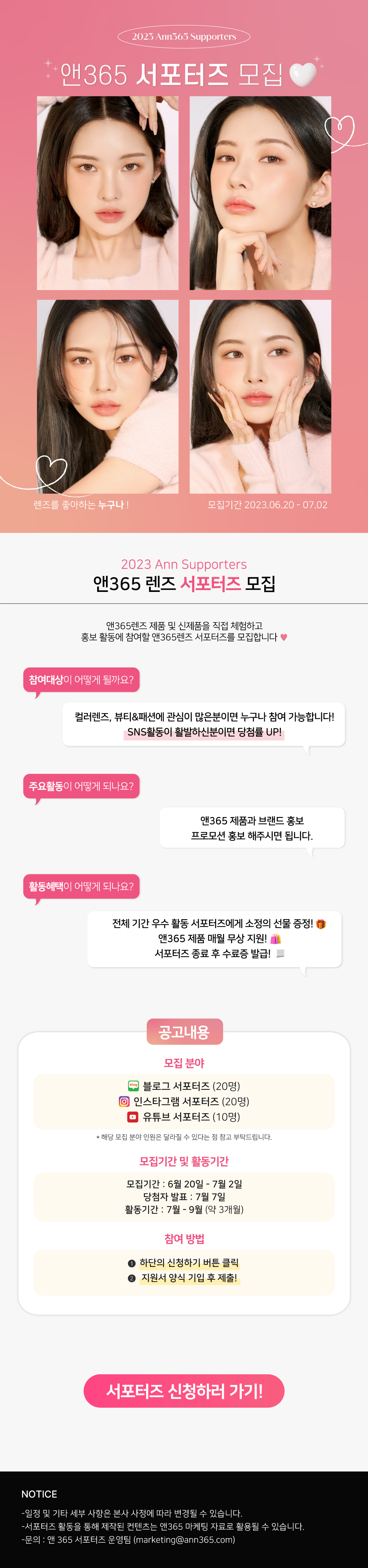 ✔️모집 기간 : \~23.07.02(일) ✔️발표 일자 : 23.07.07(금) ✔️활동 기간 : \~23.09.30 ✔️모집 부분 - 인스타그램 20명 - 블로그 20명 - 유튜브 10명 ✔️지원방법 📌앤365홈페이지(https://ann365.com) > 이벤트 > 서포터즈 모집 > 지원하기 클릭! ❤️당첨확률 높이는 팁 앤365 공식 SNS와 친구하기👩❤️💋👩 (https://www.instagram.com/ann365lens/)