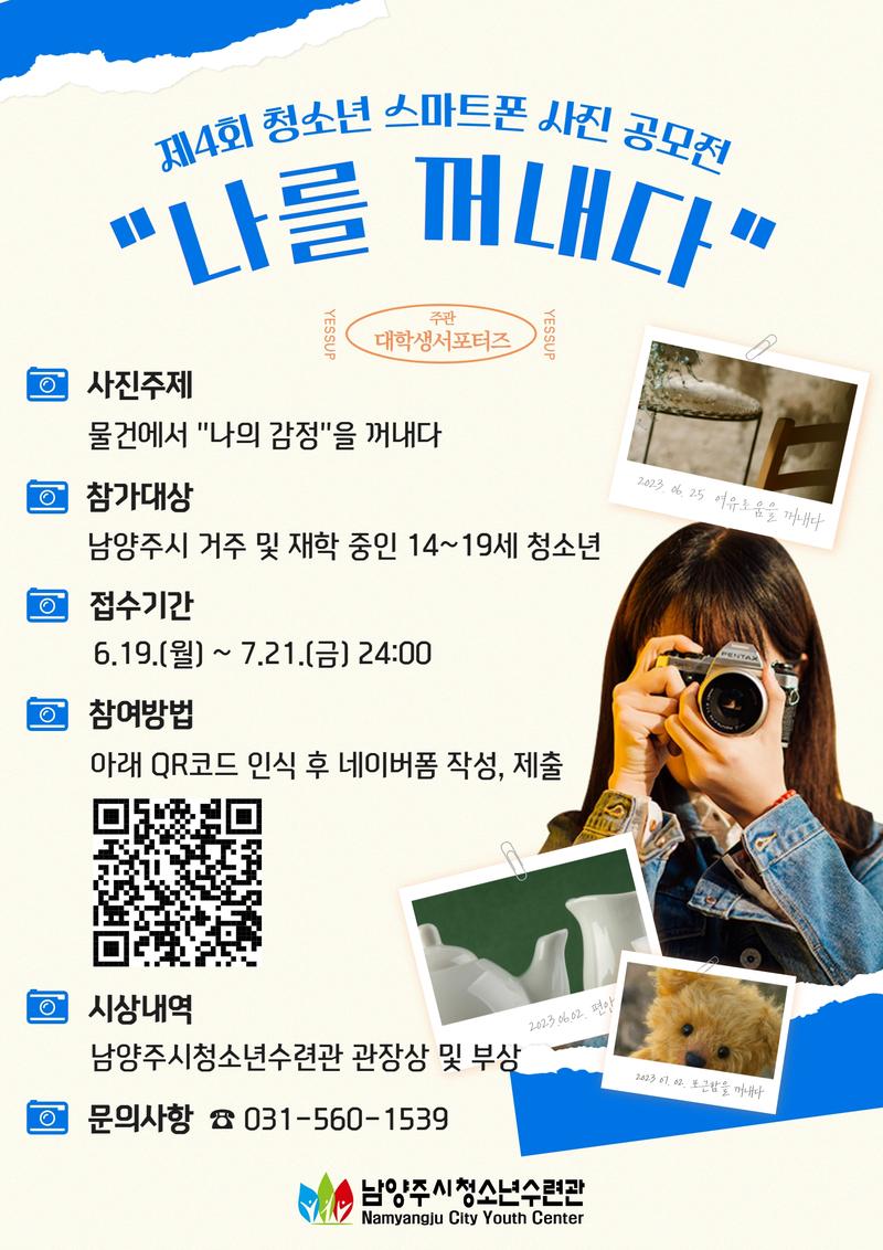 남양주시청소년수련관 대학생서포터즈[예썹]에서는 관내 청소년을 대상으로 스마트폰 사진 공모전을 개최합니다. <나를 꺼내다>라는 주제로 진행하는 제4회 청소년 스마트폰 사진 공모전에 청소년 여러분의 많은 참여를 바랍니다.