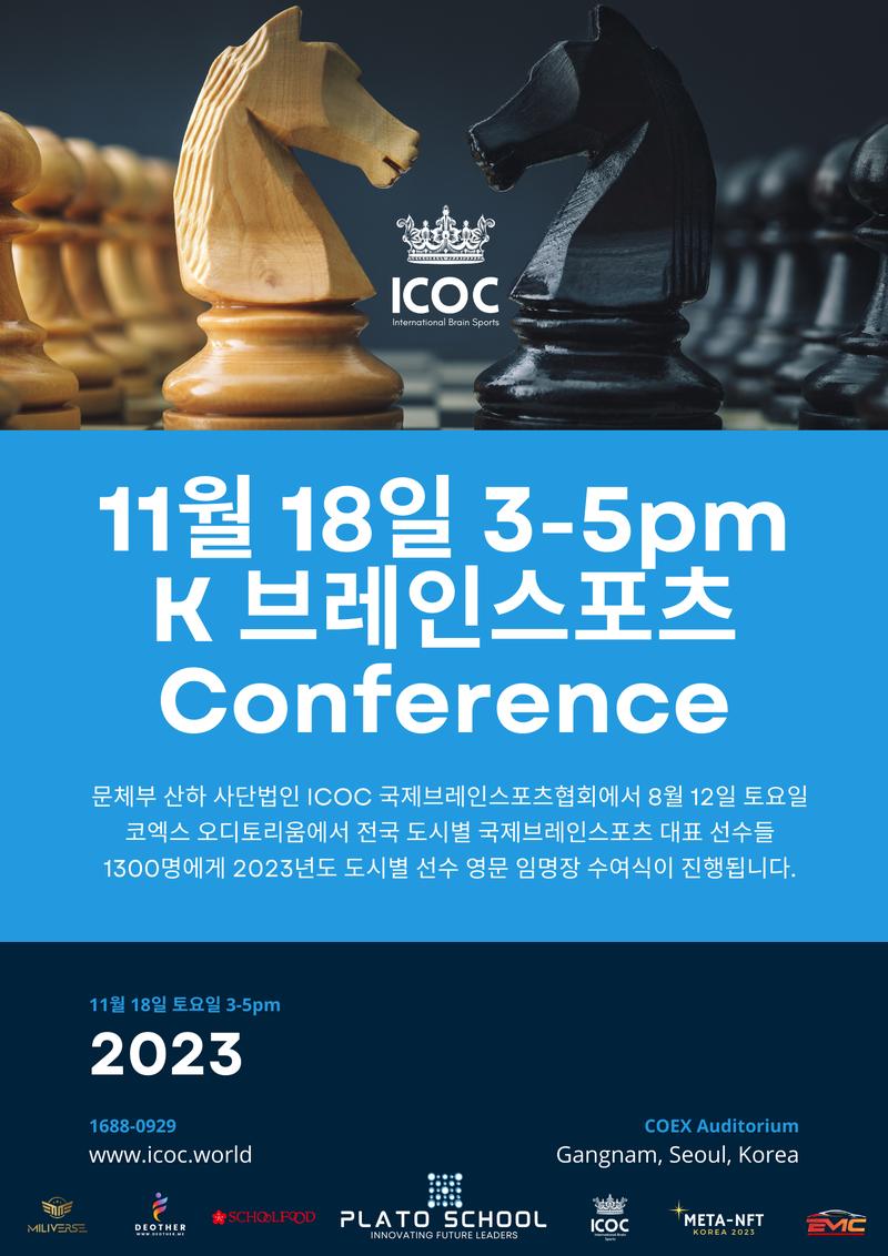 11월 18일 토요일 코엑스 오디토리움에서 대한민국 문체부 산하 사단법인 ICOC 국제브레인스포츠협회에서 전국 도시별 국제브레인스포츠 대표 선수들 1300명에게 2023년도 도시별 선수 영문 임명장 수여식이 진행됩니다.