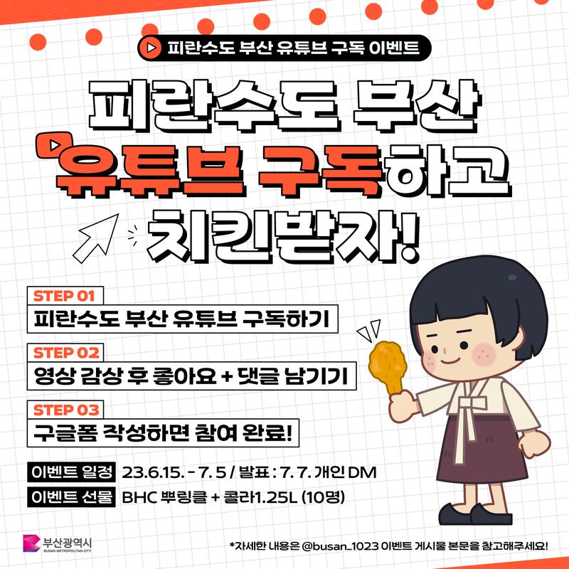 피란수도 부산 유튜브 채널 구독하면 추첨을 통해 뿌링클🍗+콜라1.25L를 드립니다!