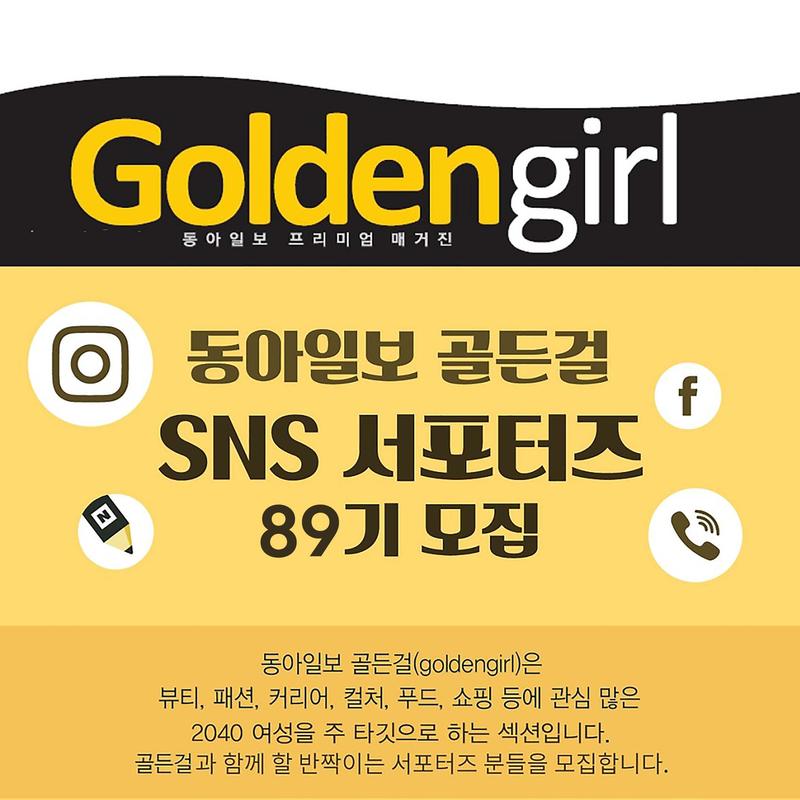 #골든걸서포터즈 동아일보 프리미엄 섹션 '골든걸' 에서 대학생 서포터즈 '89기' 를 모집합니다. 동아일보 골든걸 인스타그램, 페이스북, 포스트 홍보 & 컨텐츠 제작 등 동아일보 골든걸 함께 다양한 경험을 하고자 하는 대학생들은 여기 *주목*해주세요\~! 대학생이면 누구나 참여 가능하며, 휴학생도 지원할 수 있습니다. _ 먼저, 1. 동아일보 골든걸 공식 인스타그램, '동아일보 골든걸(@goldengirl_donga)' 을 검색해 '팔로우' 를 누르시고, 2. 동아일보 골든걸 공식 네이버 포스트, '골든걸 by 동아일보' 을 검색해 '+팔로우' 를 누르신 후, 골든걸 서포터즈를 지원해주세요! [ 모집내용 ] - 지원자격 : 대학교 재학생 / 휴학생 - 활동기간 : 2023. 6. 29. (목) \~ 2023. 8. 7. (월) / 6주간 활동 - 모집인원 : 00명 - 모집기간 : 2023. 6. 20. (화) \~ 2023. 6. 28. (수)까지 - 합격자 발표 : 2023. 6. 29. (목) / 오후 5시 이전 개별 통보 - 지원방법 : **이메일 접수(goldengirl.kr@gmail.com), 이력서(①)/자기 소개서(②) 필수 서류 제출 ① 이력서 (자유 형식 / 워드 및 한글파일) - 필수기재사항: 개인 인스타그램 아이디/페이스북 주소/이메일 주소/ 이름/생년월일/연락처/집주소/학교/학과/학년 ※ 필수기재사항 일부 누락시, 서포터즈 합격자에서 제외됩니다. ※ 이력서에 기재된 집주소는 서포터즈 특전 티켓에 전달에 활용됩니다. ※ 서포터즈 합격자 한에서, 페이스북 그룹방으로 공지사항 전달 및 활동하니 페이스북 주소 필수 기재 바랍니다. ② 자기 소개서 (자유 형식) - 골든걸 서포터즈 활동의 포부를 담아 글, 카드 뉴스, 영상 등 본인의 개성을 드러낼 수 있는 자유형식으로 제작해주세요! [ 모집대상 ] - 인스타그램/페이스북 계정 필수로, 그 밖에 블로그/포스트/유튜브 등 개인 SNS 활동에 적극적인 대학생 - 미션 기간을 지킬 수 있는 책임감 강하고 아이디어가 반짝이는 대학생 - 매체 홍보 활동에 관심 많은 대학생 - 컨텐츠 제작(주 카드 뉴스)에 능숙하고 관심 많은 대학생 [ 활동내용 ] - 동아일보 골든걸 인스타그램 @goldengirl_donga 홍보 - 동아일보 골든걸 컨텐츠 및 이벤트 홍보 - 골든걸 페이스북 주관, "89기 서포터즈 그룹방"을 통해 6주간 3개 미션 수행 [ 활동혜택 ] - 활동 만료 시, 동아일보 골든걸 활동 수료증 수여 - 우수 활동자 한에서 선물 증정 - 서포터즈 전원 전시회 티켓 증정 (1인 2매) ※ 수도권 중심 전시회로 초대권이 제공되오니, 이 점 참고 부탁드립니다. [ 문의 ] 광화문 사옥 콘텐츠기획본부 골든걸 Tel : 02-2020-0347