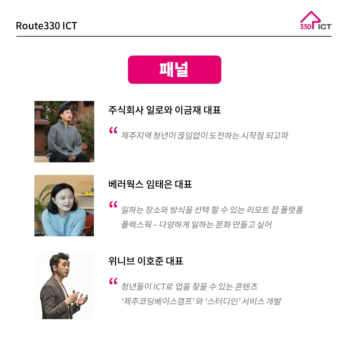 "제주지역 청년이 끊임없이 도전하는 시작점 되고파" -** 주식회사 일로와 이금재 대표 ***“일하는 장소와 방식을 선택 할 수 있는 리모트잡 플랫폼 플렉스웍- 다양한 일하는 문화 만들고 싶어" - 베러웍스 임태은 대표 청년들이 ICT로 업을 찾을 수 있는 콘텐츠 '제주코딩베이스캠프'와 '스터디인' 서비스 개발*** - 위니브 이호준 대표