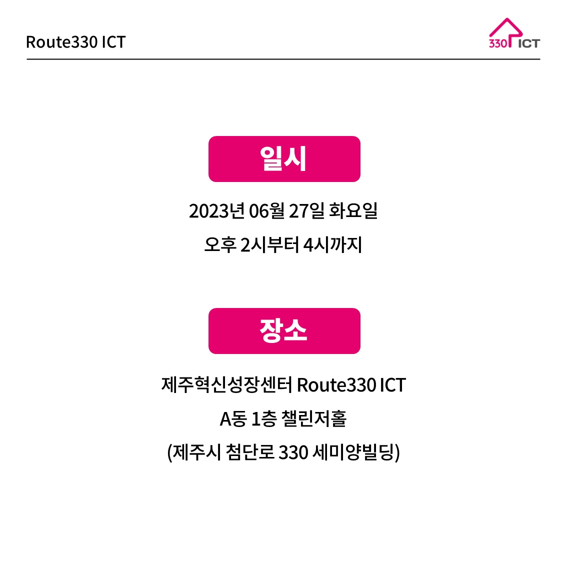 - 장소 : 제주혁신성장센터 Route330 ICT 챌린저홀 (제주시 첨단로 330 세미양빌딩 A동 1층)