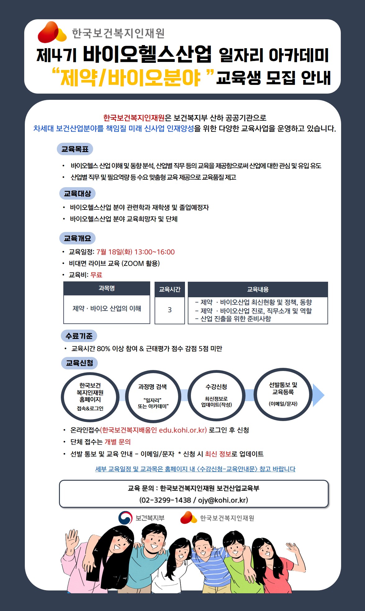 바이오헬스산업의 지역별 수요에 기반한 전문인력 양성 및 유입을 위한 ✨바이오헬스산업 일자리 아카데미✨ 교육을 진행하오니 많은 참여 부탁드립니다. 1. 교육과정: `23년 제4기 바이오헬스산업 일자리 아카데미 (제약바이오 산업의 이해) 2. 교육일정: `23. 7. 18.(화) 13:00\~16:00 3. 교육방법: 실시간 비대면(ZOOM) 교육 4. 교육비: 무료 5. 교육신청 방법: 보건복지배움인 접속 후\, '일자리' 또는 '아카데미' 검색 후 수강신청 6. 교육문의: 한국보건복지인재원 보건산업교육부 (ojy@kohi.or.kr / 02-3299-1438) 많은 참여 부탁드립니다:)