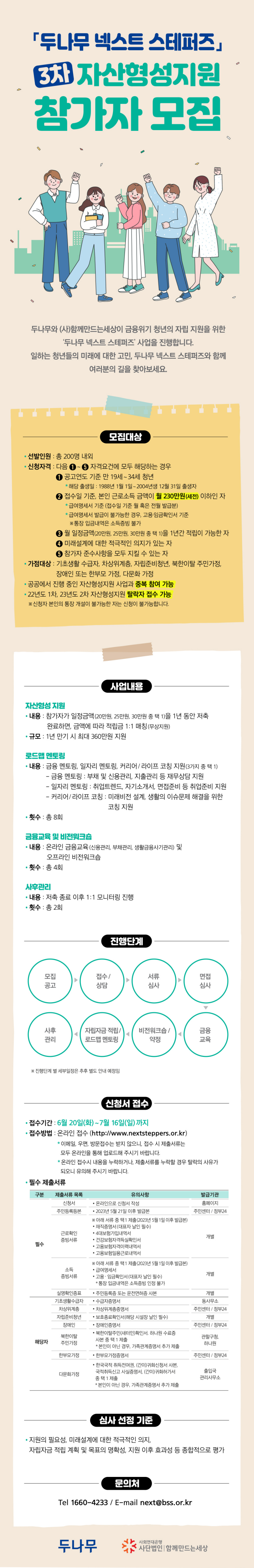 (사)함께만드는세상에서는 두나무와 함께 금융위기 청년의 자립을 위한 "두나무 넥스트 스테퍼즈" 사업을 진행합니다. 저임금 근로청년에게 자산형성의 기회와 자립역량 강화를 위한 프로그램을 지원하오니 많은 관심과 지원 바랍니다.