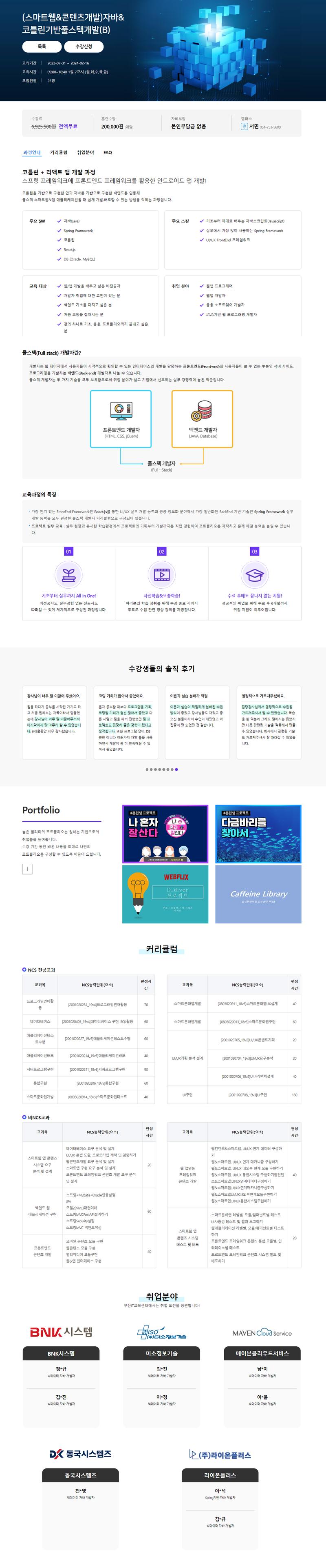 교육특징 : 프론트엔드 + 백엔드 과정으로 풀스택 개발자로 거듭날 수 있는 교육입니다. 취업수요가 가장 많은 분야로 실무 중심의 교육과정으로 취업경쟁력을 갖출 수 있습니다.
