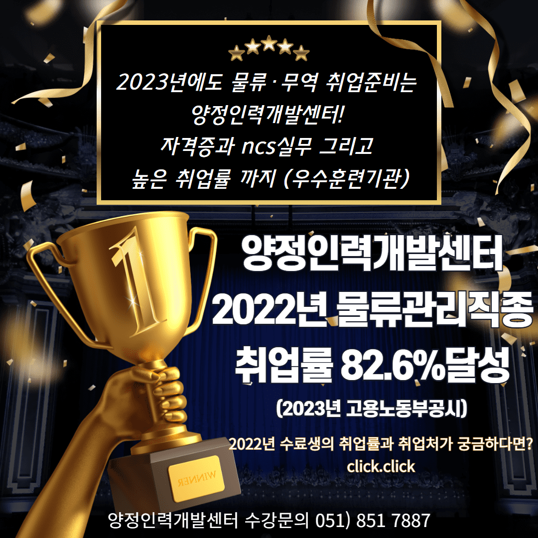 ✔️ 교육일정 : 7월 21일 \~ 11월 23일 평일반 (09:00\~ 17:30) ⭐ 교육시간 : 평일, 09:00\~17:30(8교시) 🔈 교육장소 : 양정인력개발센터 ( 부산 지하철 1호선 양정역 2번 출구 150m 지점 ) 💖과정 안내 물류·무역·운송 기초부터 심화까지 학습하여 교육 기간 내 관련 자격증 (ERP정보관리사/국제무역사/ 무역영어1급) 취득을 준비하며, 물류를 효율적으로 관리하기 위한 방안부터 운송관리, 수출입 준비와 관리, 무역서식 작성 등 실무에 필요한 핵심 내용 위주로 배울 수 있으며 무역영어, ERP정보관리사 물류/회계1급을 취득 할 수 있어 부산의 물류/무역 시장에서 선호하는 실력을 갖춘 인재로 성장합니다.