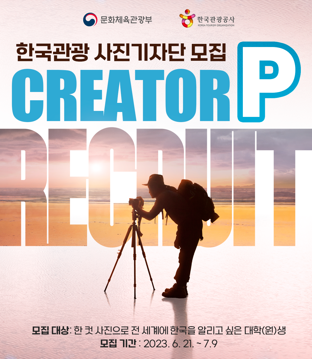 📷사진으로 전세계에 한국 관광을 알리는 대학(원)생 기자단! ’크리에이터P’ 1기를 모집합니다✨ 📣지원하기: https://bit.ly/creatorp 💡‘크리에이터P’란? - Creator + Photo 의 합성어로 한국 관광 홍보를 위한 관광지별\, 테마별 고품질 사진 콘텐츠를 확보하는 사진 기자단 입니다. - 월별 자체 사진 취재 계획 및 미션을 통해 매력적이고 트렌디한 한국 관광 콘텐츠를 확충하는 역할을 수행합니다.
