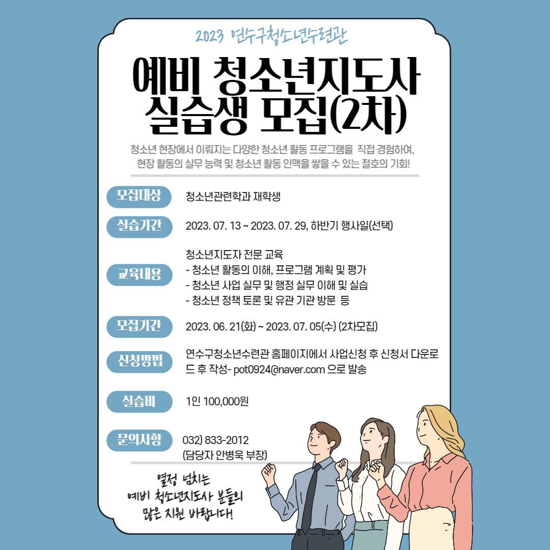 청소년지도사 예비 실습생 2차 모집을 시작합니다. 역량있는 미래의 청소년지도사들의 많은 관심과 참여를 부탁드립니다. 지금 보다 더 발전하고 성장하고 싶다면 도전하세요. 자세한 내용은 아래의 참가안내 및 신청서를 참조하세요. 인천 최고의 기관에서 청소년지도사로써의 꿈틀 키워 가시길 바랍니다. 다양한 커리큘럼으로 모든 청소년사업과 실무를 경험하실 수 있습니다.