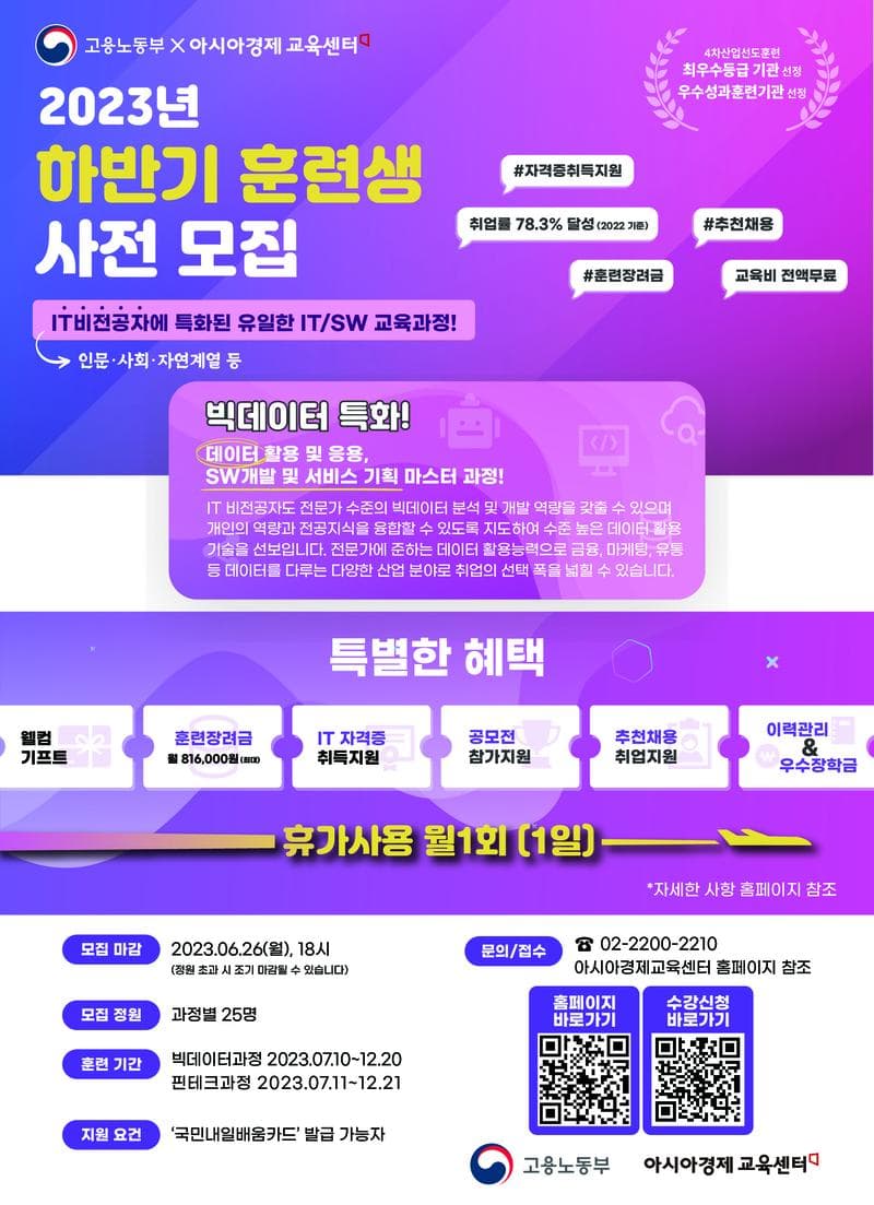아시아경제 교육센터는 취업에 포커싱을 맞춰 기업이 원하는 실무 중심의 프로젝트 훈련과 더불어 취업에 도움이 되는 다양한 취업지원 혜택, 그리고 추천채용으로 희망기업에 성공적인 취업이 될 수 있도록 지원을 아끼지 않고 있습니다. 상·하반기에 각 1회씩 연중 50명을 선발해 소수 정예로 운영하는 이번 교육과정에 참여하시고 인생의 터닝포인트가 되시길 기원합니다.