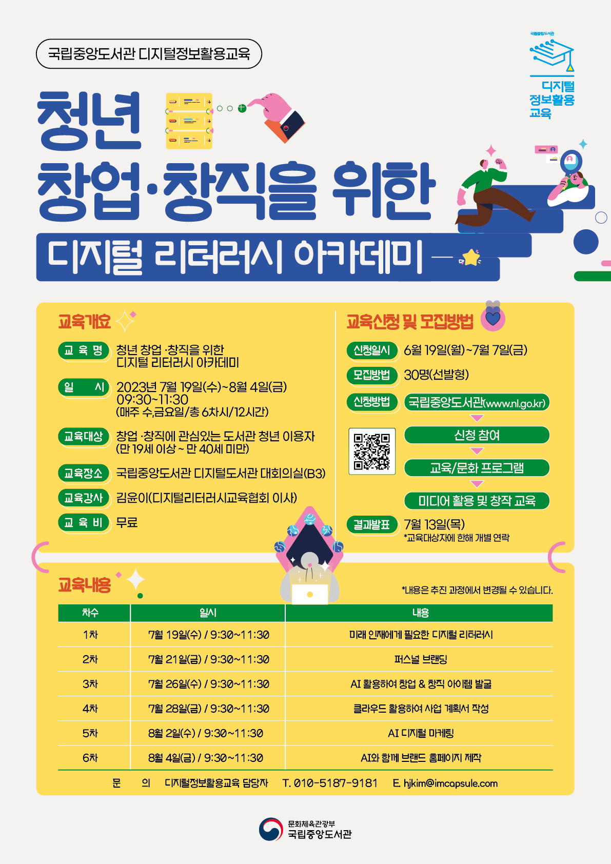 국립중앙도서관에서는 청년의 디지털 리터러시 역량 강화를 위한 <청년 창업·창직을 위한 디지털 리터러시 아카데미>를 다음과 같이 실시합니다. 디지털 미디어 기술을 활용한 창업·창직에 관심있는 청년 이용자분들의 많은 참여를 바랍니다.