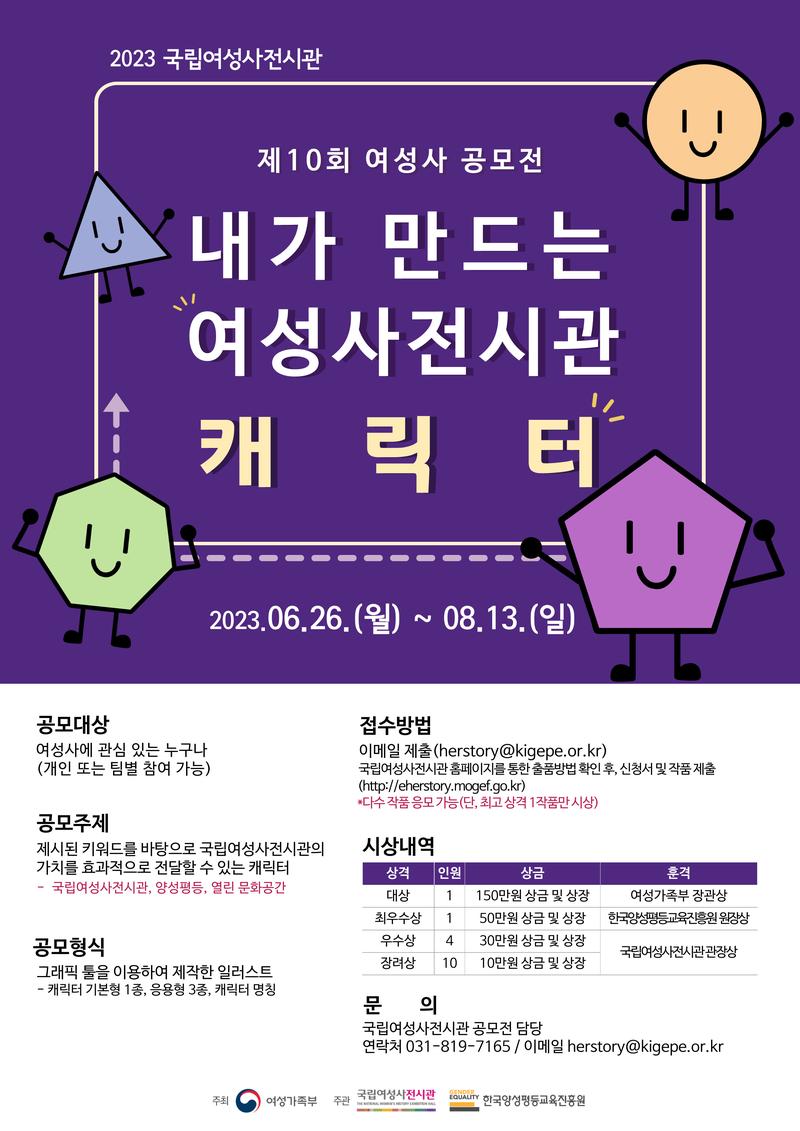 □ 작품접수 : 2023. 6. 26.(월) \~ 8. 13.(일) ◦ 접 수 처 : 이메일(herstory@kigepe.or.kr) 제출 ◦ 접수방법 : ① 참가 신청서 및 관련서식 각 1부, ② 작품 파일(이미지 파일, 원본파일 각 1부) ※ 신청서 등 양식을 국립여성사전시관 홈페이지에서 다운받아 작성 후 작품접수 시 작품파일(JPG, PNG 등)과 함께 제출하시기 바랍니다. □ 최종발표: 2023. 9. 4.(월), 16:00(예정) / 국립여성사전시관 홈페이지 □ 시 상 : 시상식 관련 사항은 최종발표 이후 별도 공지 예정 □ 주 최 : 여성가족부 □ 주 관 : 국립여성사전시관, 한국양성평등교육진흥원 5. 문의처 : 국립여성사전시관 (031-819-7165) / elly@kigepe.or.kr