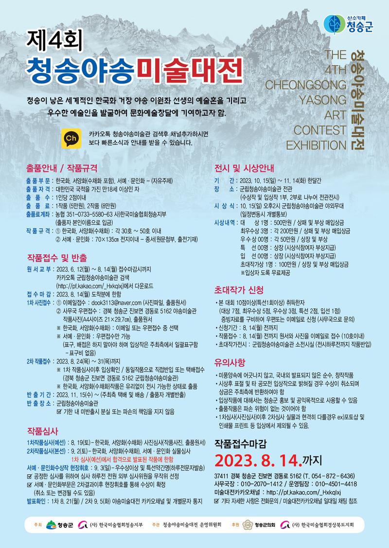 2023년 제4회 청송야송미술대전 전국 작품공모 및 수상작및 전시회 개최를 다음과 같이 공고합니다. ☑공모요강 및 자세한사항은 카카오채널(군립청송야송미술관)에서 확인하실수 있습니다. (아래링크)