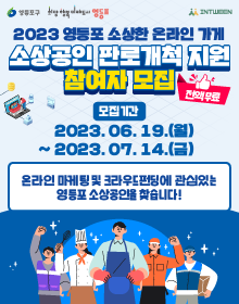브랜딩, 마케팅 및 크라우드펀딩 역량 강화를 무.료.로 지원해드리니 영등포 소상공인분들의 많은 관심과 참여 바랍니다! 📍사업명 : 2023 영등포 소상한 온라인 가게 📍모집기간 : 2023. 06.19 \~ 2023. 07. 14 📍사업지원기간 : 2023. 07. \~ 2023. 11. 📍혜택 - 온라인 마케팅/크라우드펀딩 교육 (7월 말 진행) - 분야별 1:1 컨설팅 - 분야별 300만원 상당의 디지털 마케팅 또는 크라우드펀딩 오픈 지원🤝 📍접수방법 - 아래 링크 접속 후 신청서 작성하여 이메일 접수 🔖링크 : https://bit.ly/2023ydp_소상한온라인가게_모집 🔖접수처 : esing@intw.co.kr 🔖신청 자격 - 공고일 기준 사업자 소재지가 영등포구 관내인 소상공인 - 상시 근로자 수가 5인 미만인 사업자(제조업\, 광업\, 건설업\, 운수업의 경우 10인 미만) 📍문의처 - (주)인트윈 지원사업 운영팀 📞070-8664-1576 📧esing@intw.co.kr