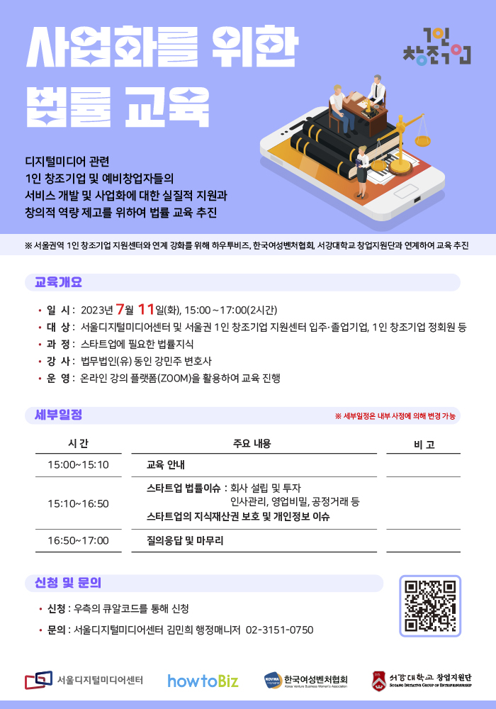 서울디지털미디어센터는 디지털미디어 분야 특화센터로, 디지털미디어 관련 창업·벤처 기업의 창의적 아이디어 사업화를 지원하고 있습니다. 이번 진행되는 교육에서는 디지털미디어 분야 1인 창조기업 및 예비창업자들의 서비스 개발 및 사업화에 대한 실질적 지원과 창의적 역량 제고를 위하여 법률 교육을 추진하고자 합니다.