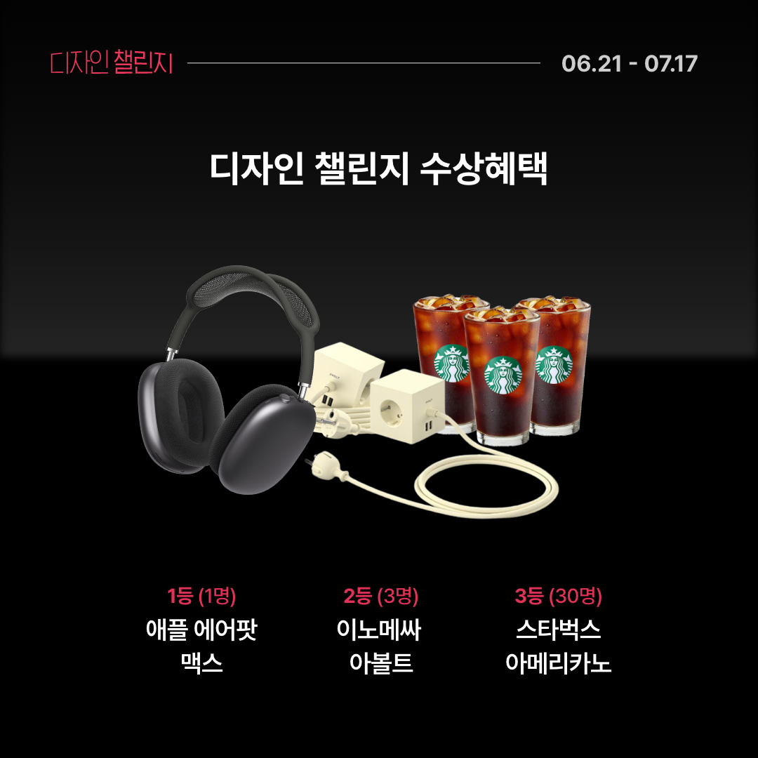 🎁 우승 상품 1등 : 🎧 애플 에어팟 맥스 (1명) 2등: 🔌 이노메싸 아볼트 (3명 3등: ☕️ 스타벅스 아메리카노 (30명) 그리고, 50만원 상당의 아키스케치 무료 크레딧이 기다리고 있어요!