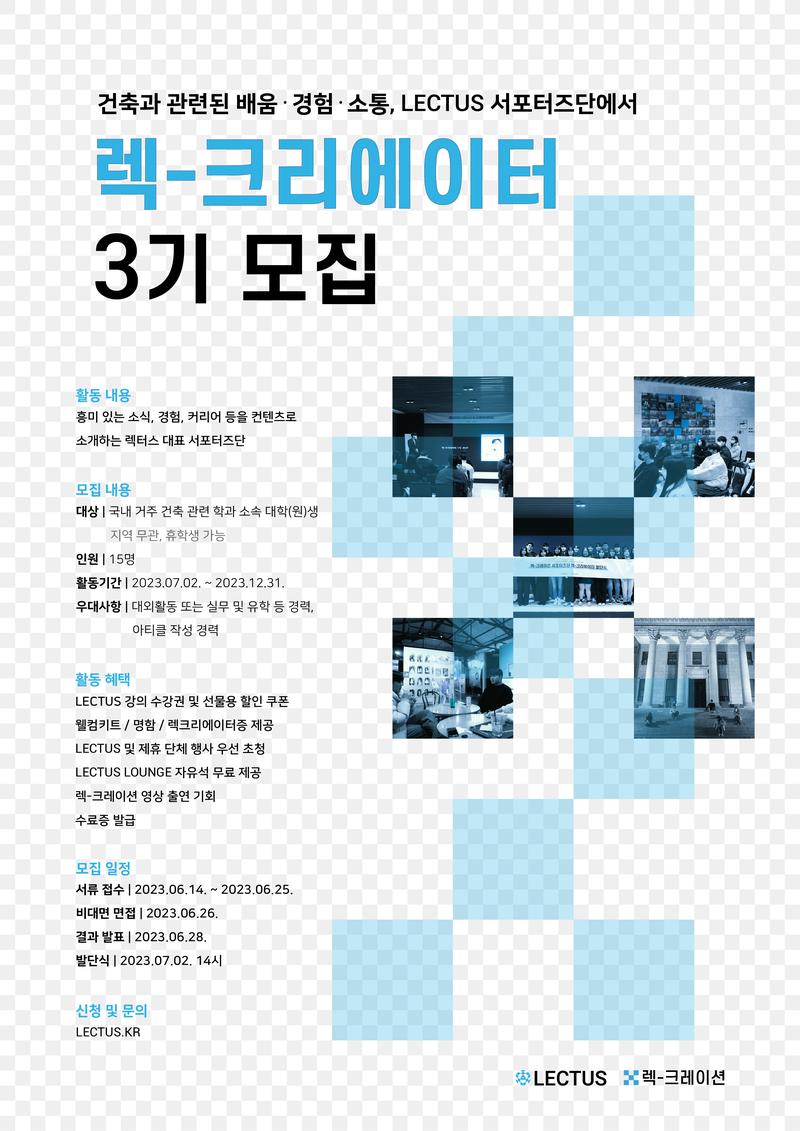 LECTUS는 지난 2020년 부터 건축 관련 분야 학생 분들의 창작활동지원을 위해 [렉-크레이션]이라는 이름으로 각종 지원활동을 이어오고 있습니다.