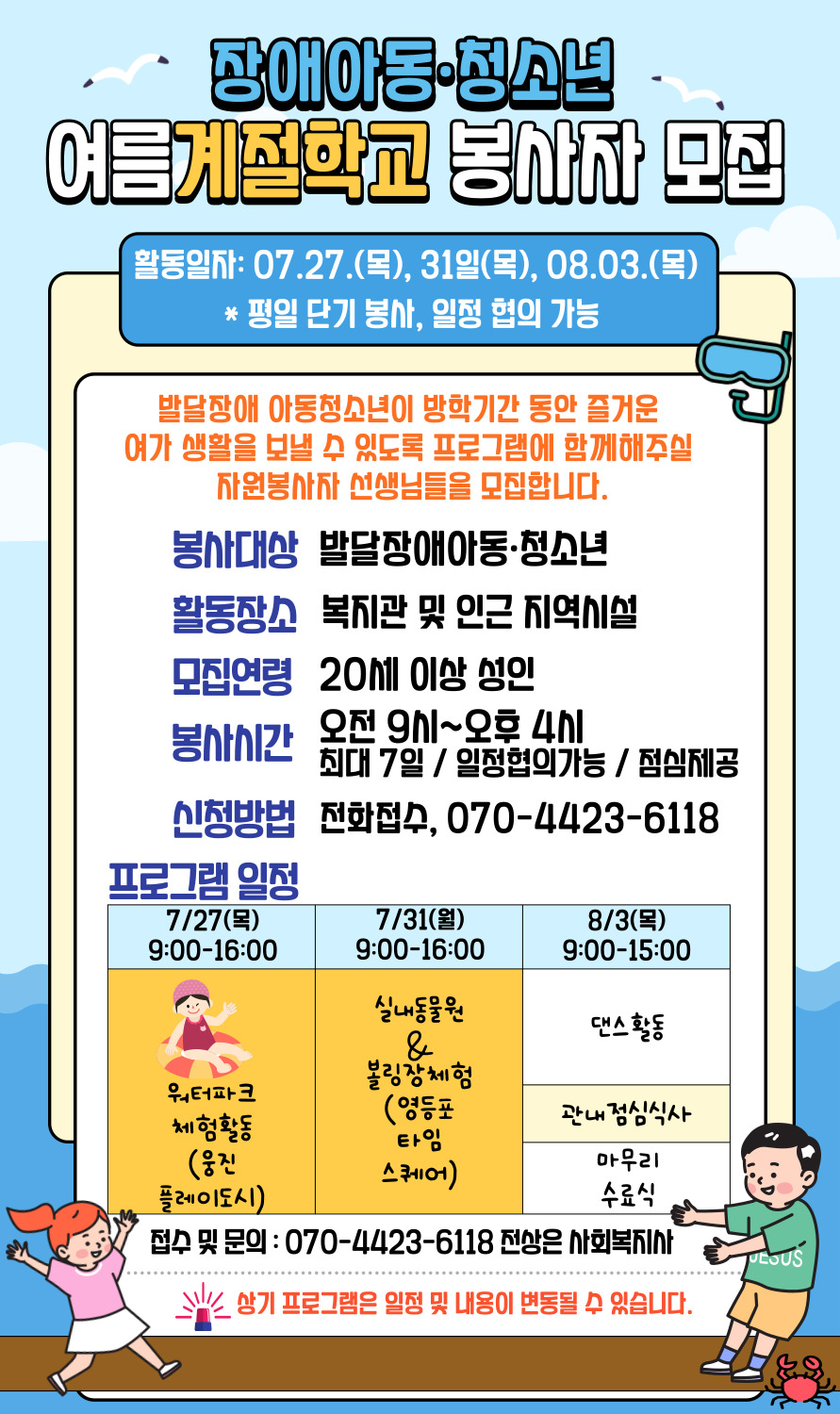 안녕하세요. 성프란치스꼬장애인종합복지관입니다^^ 발달장애 아동청소년이 방학기간 동안 즐거운 여가생활을 보낼 수 있도록 방학 프로그램에 함께 참여해주실 자원봉사자를 모집합니다!