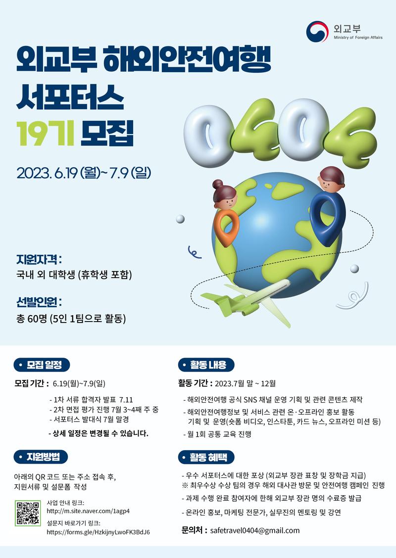 ✈️ 해외안전여행의 든든한 동반자 해안서가 19기로 돌아왔습니다! 👏🏻✈️ 외교부와 함께 해외안전여행정보 및 서비스를 쉽고, 재미있게 홍보하여 국민들의 안전한 해외여행을 도모할 서포터스를 모집합니다.🙋🏻♂️🏝️🌏
