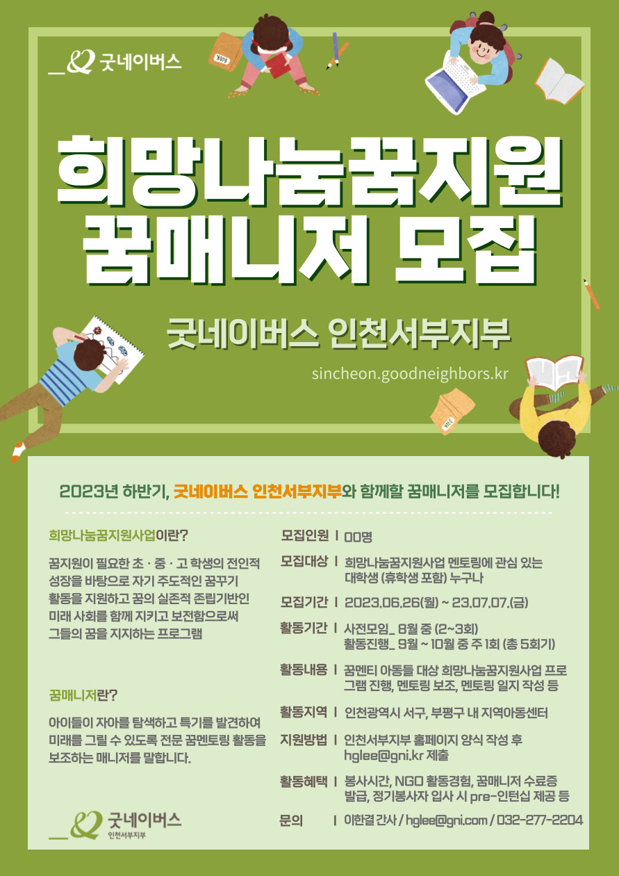 - 꿈매니저란? 아이들이 자아를 탐색하고 특기를 발견하여 미래를 그릴 수 있도록 전문 꿈멘토링 활동을 보조하는 매니저를 말합니다. - 희망나눔꿈지원사업이란? 꿈지원이 필요한 초*중*고학생의 전인적 성장을 바탕으로 자기 주도적인 꿈꾸기 활동을 지원하고 꿈의 실존적 존립기반인 미래 사회를 함께 지키고 보전함으로써 그들의 꿈을 지지하는 프로그램 - 모집인원: 00명 - 모집대상: 희망나눔꿈지원사업 멘토링에 관심 있는 대학생(휴학생 포함) 누구나 - 모집기간: 6월 26일 \~ 7월 7일 - 활동기간 사전모임: 8월 중(2\~3회) 활동진행: 9월 \~ 10월 중 주 1회(총 5회기 활동) 활동내용: 꿈멘티 아동들 대상 희망나눔꿈지원사업 프로그램 진행, 멘토링 보조, 멘토링 일지작성 등 - 활동지역: 인천광역시 서구, 부평구 내 지역아동센터 - 지원방법: 인천서부지부 홈페이지 양식 작성 후 hglee@gni.kr 제출 - 활동혜택: 봉사시간, NGO 활동경험, 꿈매니저 수료증 발급, 정기봉사자 입사 시 pre- 인턴십 제공 등 - 문의: 이한결 간사 / hglee@gni.kr / 032-277-2204