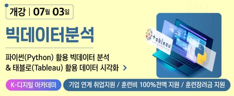 ✔ 태블로 유료버전(데스크탑) 활용 수업진행! ✔ 기업체 현장 전문가의 태블로 실전강의! ✔ 공공데이터를 활용한 빅데이터 프로젝트! ✔ 태블로 활용한 데이터 시각화 프로젝트!
