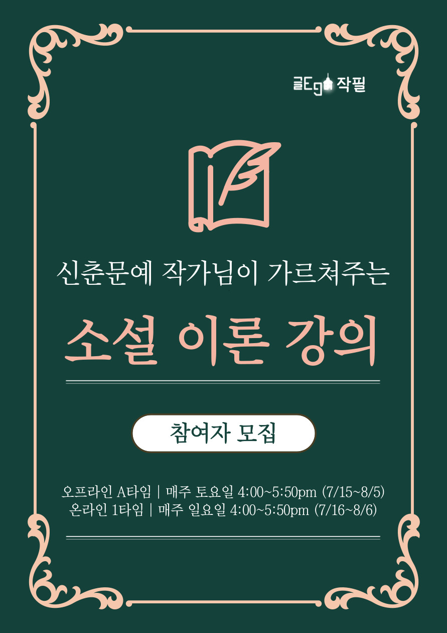 ▷ 작필 소설 이론 중급반 상세 안내 보러가기: https://cafe.naver.com/egowriting/13247 ▷ 작필 소설 고급반 상세 안내 보러가기: https://cafe.naver.com/egowriting/13658