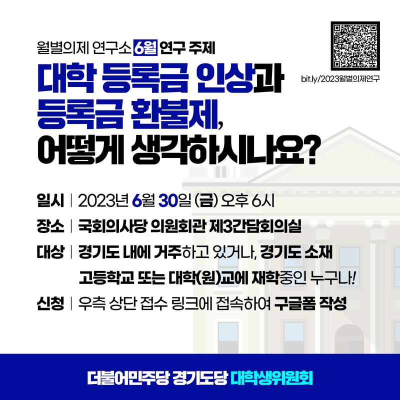 * 일시: 2023. 06. 30. (금) 18:00 * 장소: 국회의원회관 제3간담회의실 * 대상: 경기도 내에 거주하거나, 경기도 소재 고등학교 또는 대학교에 재학중인 누구나 * 문의: 정책국장 이윤빈 (010-9470-9641) * 신청: bit.ly/2023월별의제연구 (국회의원회관 출입 등록을 위해 사전 신청은 필수입니다)