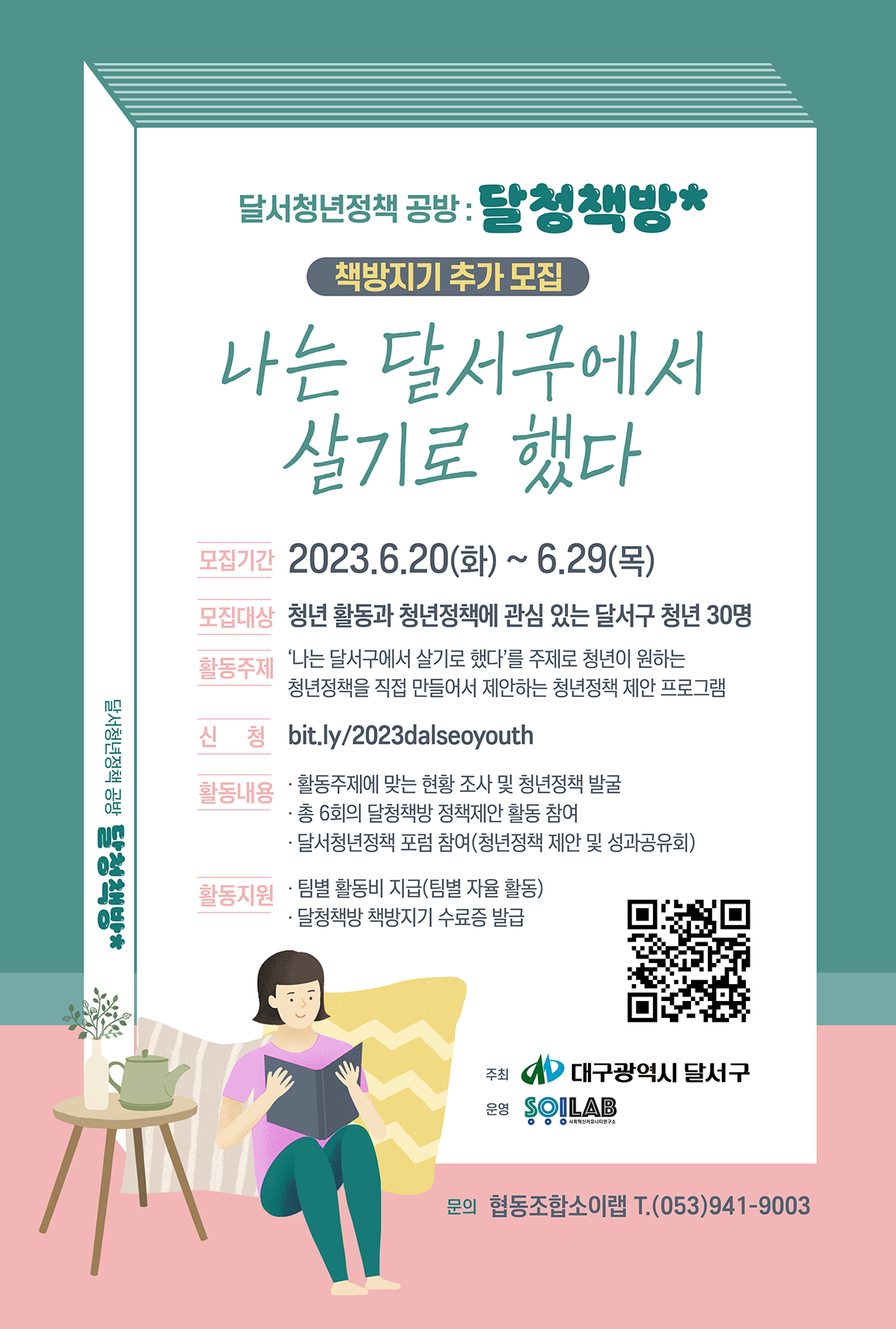 지역 청년문제에 대한 지속적인 토론과 타 지역 우수 청년활동 사례 벤치마킹을 통해 청년세대 삶의 가치와 생활환경 변화에 맞춘 실효성 있는 시책을 발굴하기 위한 활동으로, ‘나는 달서구에 살기로 했다.’를 주제로 하여 청년이 원하는 청년정책을 직접 만들어서 제안하는 청년정책 제안 프로젝트입니다. 📍 활동내용 • ‘나는 달서구에 살기로 했다.’라는 주제에 맞는 현황 조사 및 청년정책 발굴 • 총 6회의 달청책방 정책제안 활동 : 발대식 및 역량강화 교육 / 워크숍 및 팀별활동 / 선진지 답사 • 주요 혜택 : 팀별 활동비 지급 / 달청책방 책방지기 수료증 발급 • 활동 기간 : 2023. 7. 20.(목) \~ 2023. 9. 14.(목) • 달서청년정책포럼 : 2023. 9. 14.(목) 19:00 📍 신청방법 • 공고 링크 : bit.ly/2023dalseoyouthinfo • 공고문 내 지원신청서 작성 및 신청 제출 • 신청 제출 : bit.ly/2023dalseoyouth
