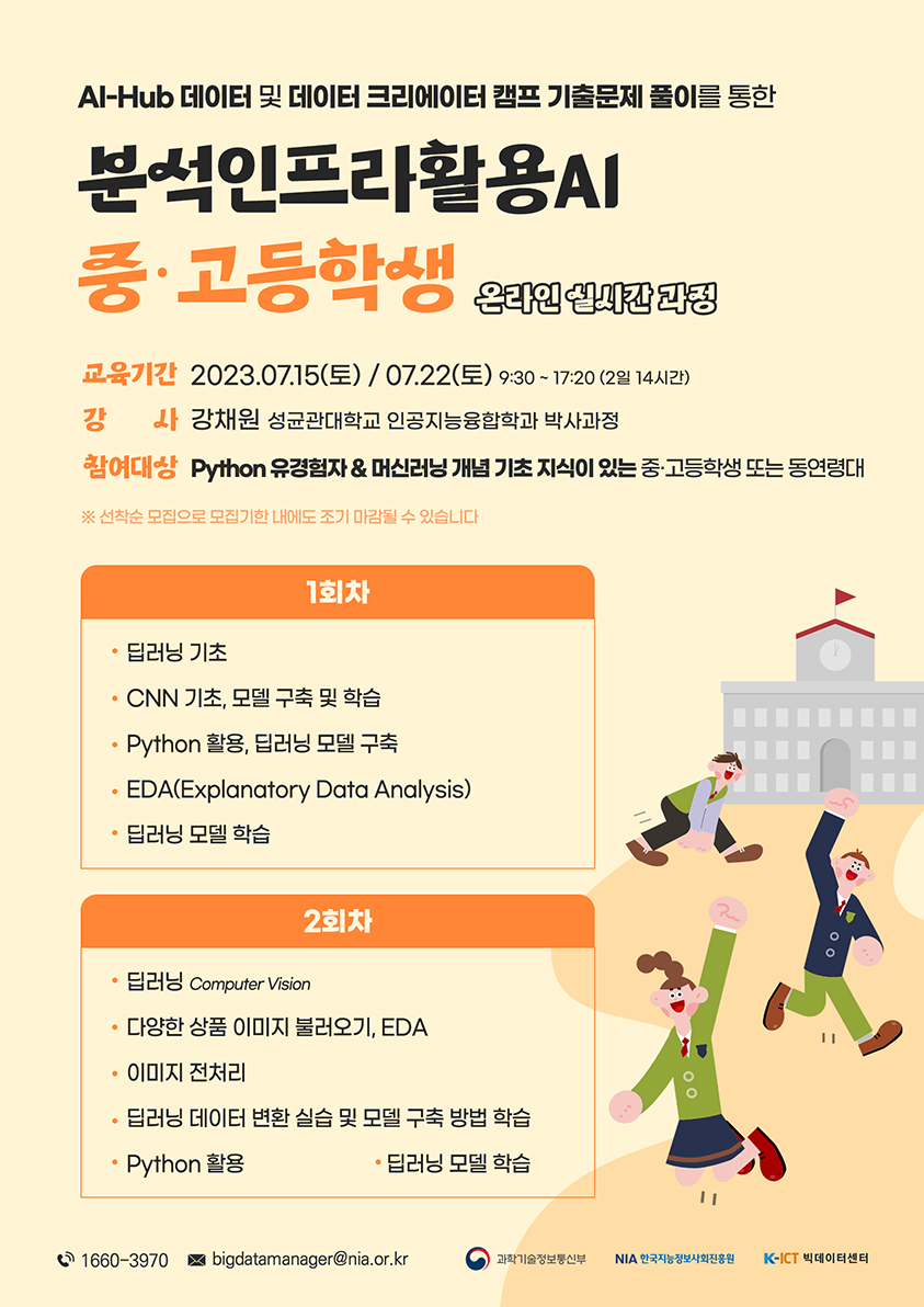 ·접수기간: 06.26(월)\~07.07(금) ·교육방법: Zoom을 통한 온라인 실시간 과정 ·신청방법 1) K-ICT 빅데이터센터 홈페이지 ( https://kbig.kr/ ) 회원가입 2) 교육 및 세미나에서 해당 과정 클릭 3) 교육신청 클릭 - 개인정보활용 동의 회신