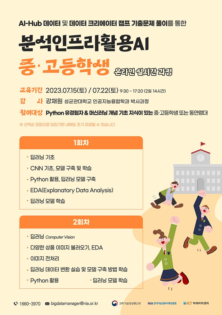 참여대상 Python 유경험자 & 머신러닝 개념 기초 지식이 있는 있는 중·고등학생 또는 동연령대 ※ 선착순 모집으로 모집기한 내에도 조기 마감될 수 있습니다