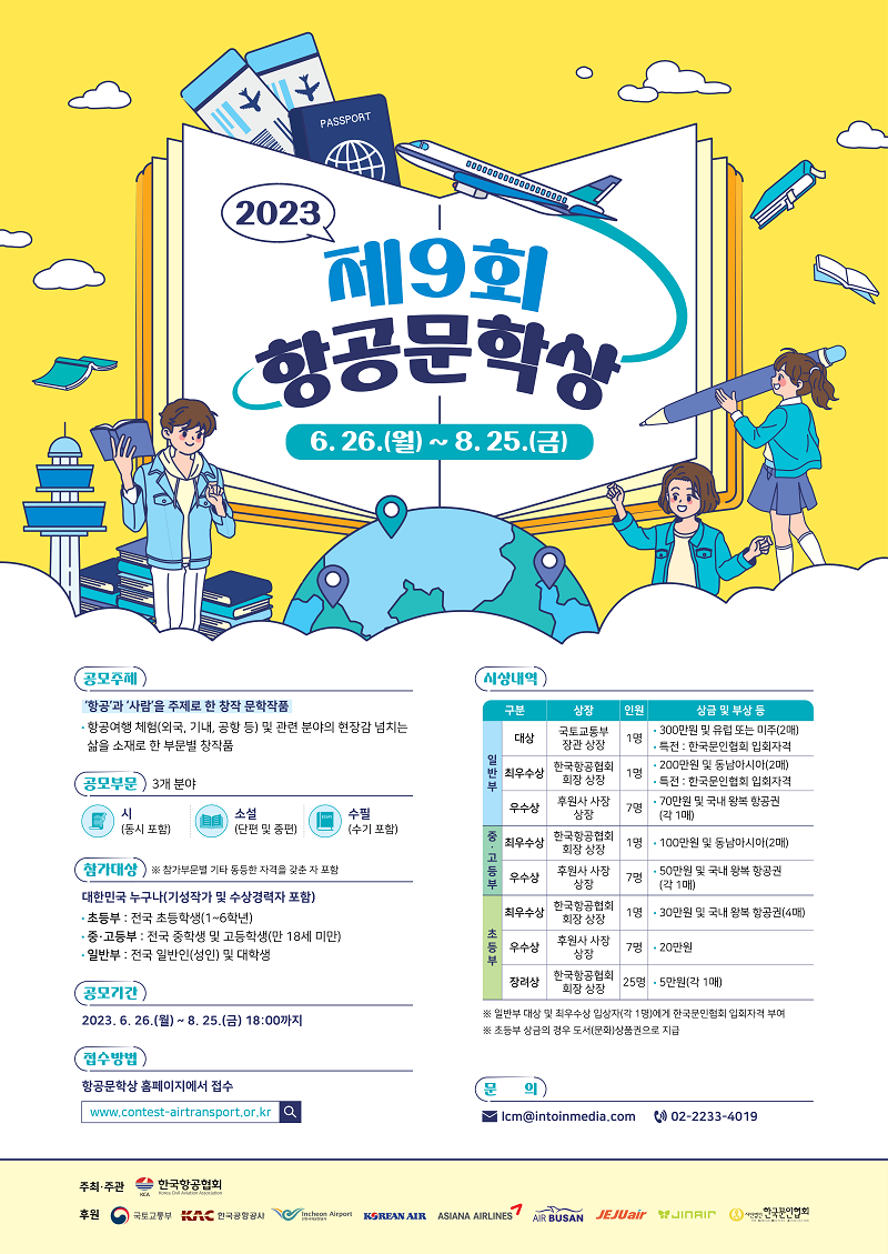 응모주제 '항공'과 '사람'을 주제로 한 창작 문학작품 · 항공여행 체험(외국, 기내, 공항 등) 및 관련 분야의 현장감 넘치는 삶을 소재로 한 부문별 창작품
