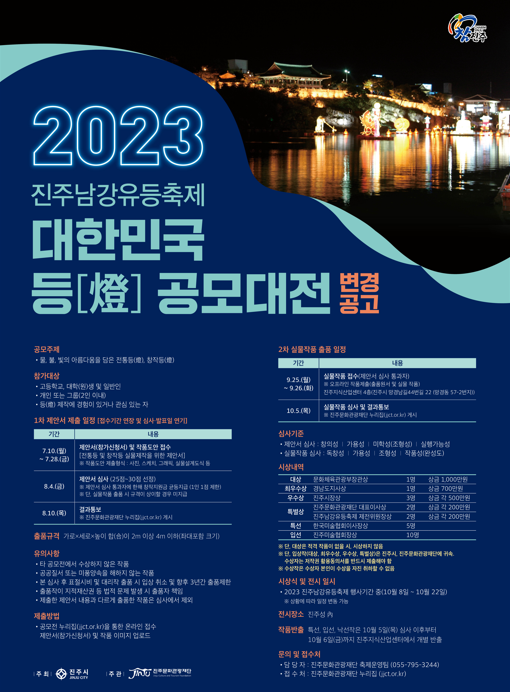 ■ 공모 주제 물, 불, 빛의 아름다움을 담은 전통 등(燈) 및 창작 등(燈) ■ 지원 자격 - 고등학교, 대학(원)생 및 일반인 - 개인 또는 그룹(2인 이내) - 등(燈) 제작에 경험이 있거나 관심 있는 자 ■ 모집 기간 -1차 제출기간(제안서) : 7월 10일(월) \~ 7월 28일(금) -1차 심사발표 : 8월 10일(목) -2차 제출기간(실물작품) : 9월 25(월) \~ 9월 26일(화) -2차 심사발표 : 10월 5일(목) ■ 지원 방법 참가신청서와 작품도안을 진주문화관광재단 누리집(jjct.or.kr)에 업로드 -참가신청서 : 누리집 공지사항에서 참가신청서 다운로드 -작품도안 : 자유형식 (작품을 나타낼 수 있는 사진, 스케치, 그래픽, 실물설계도식 등) ■ 시상내역