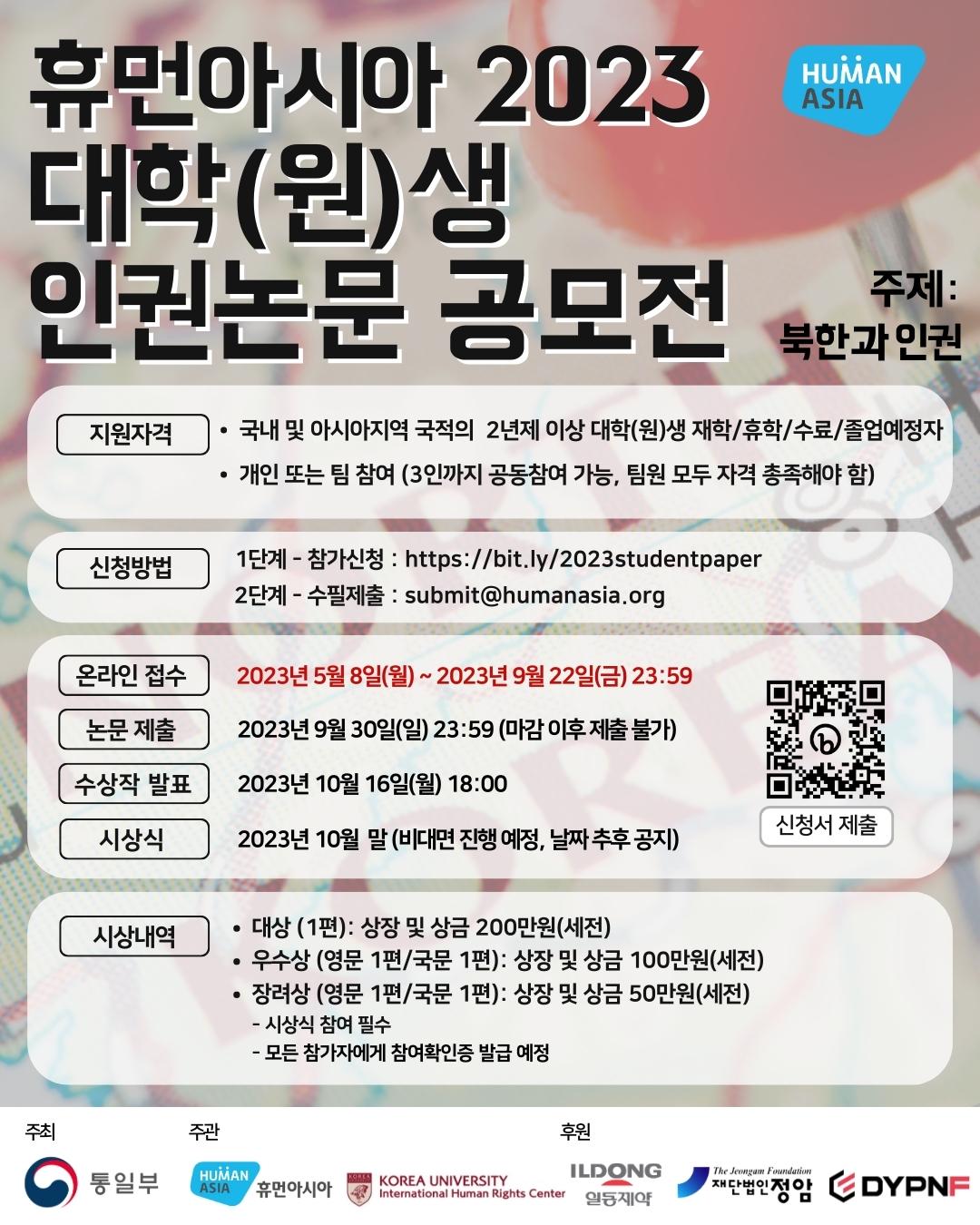 ▶ 주제: ‘북한과 인권’ ▶ 신청서 접수기간 : 2023년 5월 8일(월) \~ 2023년 9월 22일(금) ▶ 논문 제출기간 : 2023년 9월 30일 23:59시까지 ▶ 수상작 발표 : 2023년 10월 16일 오후 6시 ▶ 시상식 및 논문발표 : 2023년 10월 말(비대면 진행 예정, 날짜 추후 공지) ▶ 등록링크: https://bit.ly/2023studentpaper ▶ 시상 내역 대상(1편) - 상장 및 상금 200만원 우수상(영문 1편/국문 1편) - 상장 및 상금 100만원 장려상(영문 1편/국문 1편) - 상장 및 상금 50만원 *시상식 참여 필수 *모든 참가자에게 참여확인증 발급