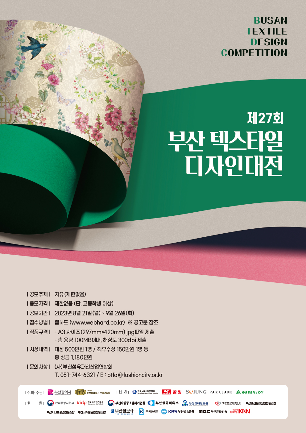 -목적 : 섬유 및 텍스타일 분야의 고급 인재 발굴 및 육성 -접수기간 : 2023. 08. 21.(월) \~ 09. 26.(화) 17:00까지 -접수대상 : 학생, 일반 -시상 및 시상금 : 대상 – 산업통상부장관상 및 시상금 500만원 / 시상금 – 총 1,180만원
