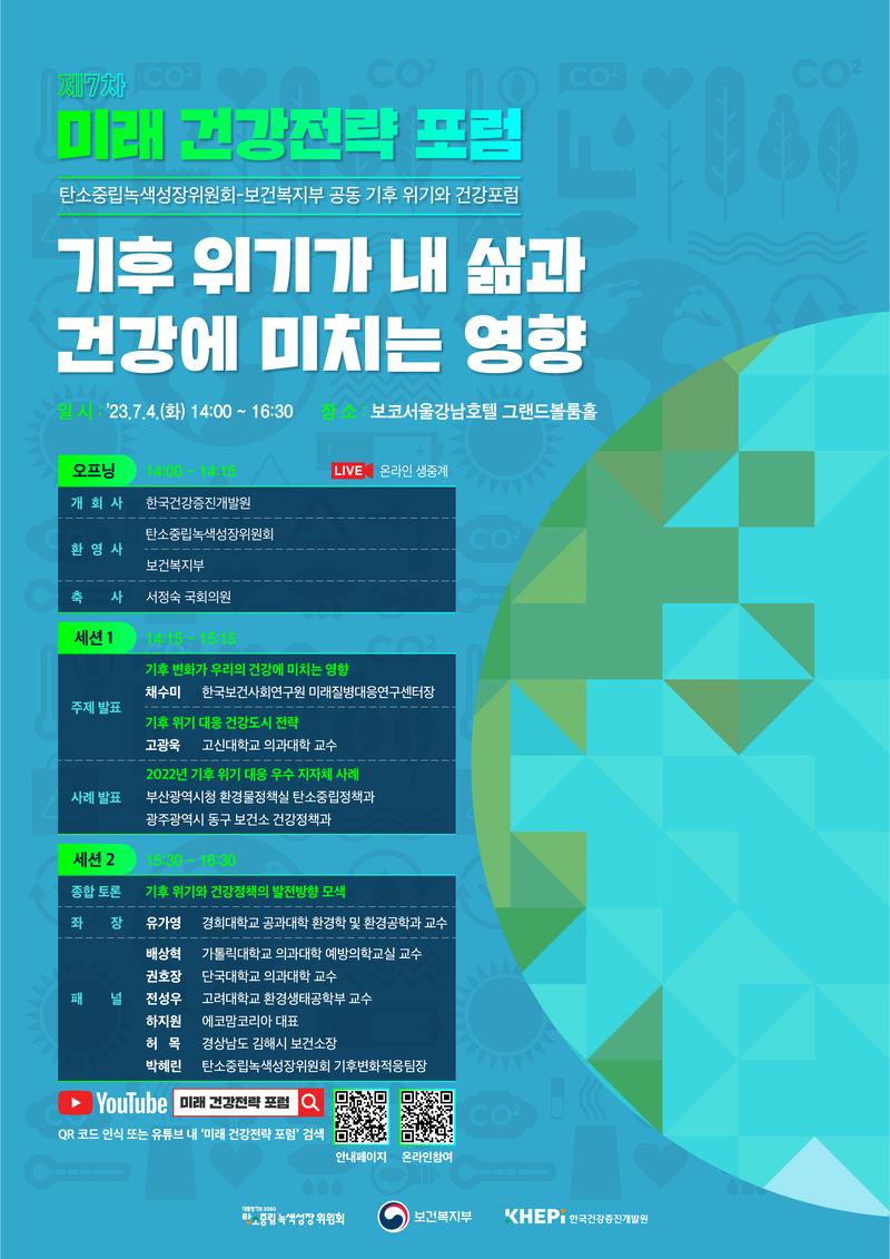 ▣ 대상 : 건강정책 관련 이슈에 관심 있는 누구나 ▣ 일정 : 2023년 7월 4(화) 14:00 \~ 16:30 ▣ 장소 : Youtube 내 '한국건강증진개발원' 검색 또는 포스터 내 'QR코드' 인식하여 실시간 스트리밍 입장 ▣ 주관 : 2050 탄소중립녹색성장위원회, 보건복지부, 한국건강증진개발원 ▣ 7차 포럼 안내 링크 : https://futurehealthforum.imweb.me/7th-forum ▣ 문의 : 한국건강증진개발원 홈페이지 (khepi.or.kr) 한국건강증진개발원 페이스북 한국건강증진개발원 한국건강증진개발원 인스타그램 한국건강증진개발원(@k_health_promotion)