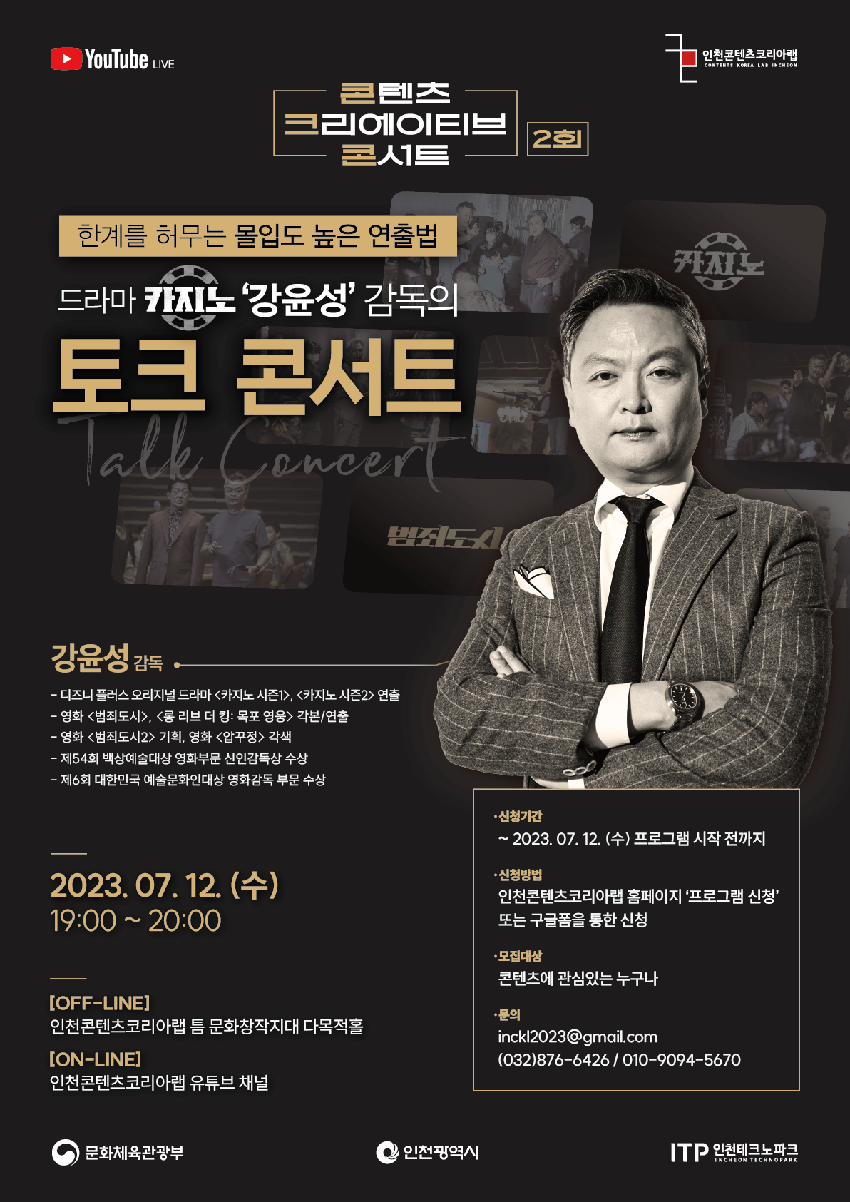 ▶ 일시: 2023. 07. 12. (수), 19:00 \~ 20:00 (약 1시간 예정) ▶ 장소: [OFF-LINE] 인천콘텐츠코리아랩 틈 문화창작지대 다목적홀 [ON-LINE] 인천콘텐츠코리아랩 유튜브 채널 ▶ 신청: 인천콘텐츠코리아랩 홈페이지 ‘프로그램 신청(https://zrr.kr/i8yg)’ 또는 구글 폼을 통한 신청(https://zrr.kr/gf8W) *신청 접수 시 일행 동반 입장 가능 ▶ 문의: 032) 876-6426 / inckl2023@gmail.com (인천콘텐츠코리아랩 운영사무국)