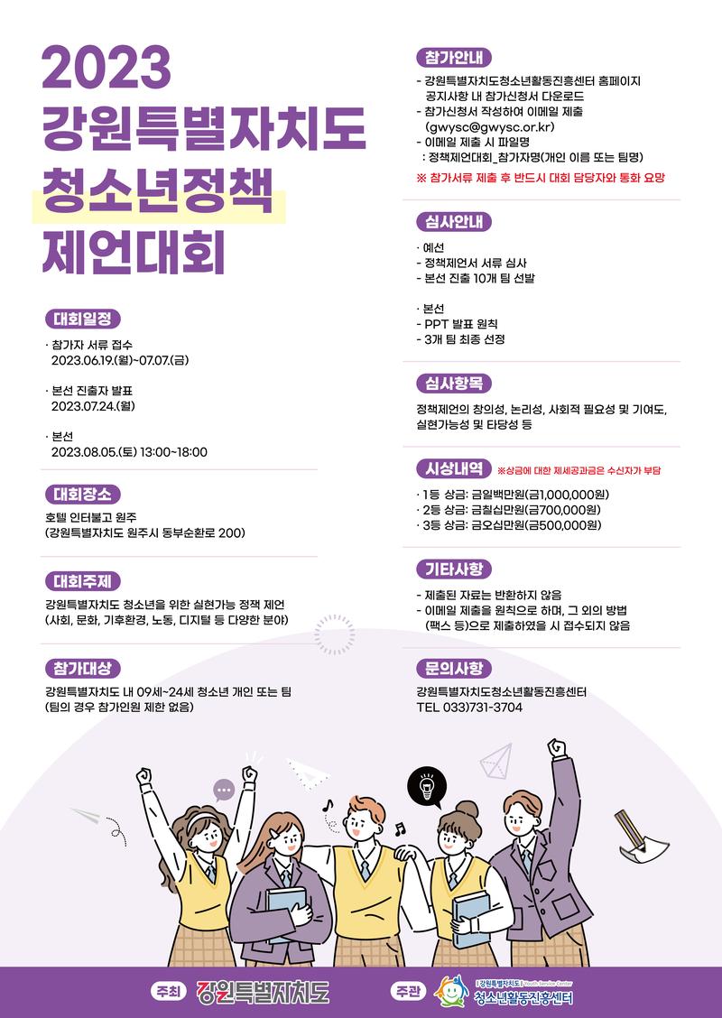 행 사 명: 2023 강원특별자치도 청소년정책 제언대회 행사목적 - 강원특별자치도 내 청소년들이 청소년의 시각으로 관련 정책을 제언하고, 반영될 수 있도록 한다. - 청소년이 함께 만드는 강원특별자치도를 통해 청소년참여 활성화를 도모한다. 일정안내 1) 서류접수: 2023.06.19.(월)\~07.07.(금) 2) 본선 진출자 참가발표: 2023.07.24.(월) 센터홈페이지 및 선정 팀 개별 연락 3) 본 선: 2023.08.05.(토) / 호텔인터불고 원주 참가대상: 강원특별자치도 내 만 9세\~24세 청소년 개인 또는 팀 대회주제 - 강원특별자치도 청소년을 위한 실현가능한 정책 제언 (사회, 문화, 기후환경, 노동, 디지털 등 다양한 분야) 신청방법 - 센터 홈페이지 공지사항 → 2023 강원특별자치도 청소년정책 제언대회 개최안내 → 제출서류 다운로드 → [붙임2] 참가 신청서 및 개인정보 활용 동의서, [붙임3]정책 제언서 작성 후 센터 이메일(gwysc@gwysc.or.kr)로 송부(PDF 및 한글파일 원본 모두 제출) ※ 파일명: 정책제언대회_참가자명(또는 팀명) 예선심사 - 정책제언서 서류 심사 - 본선 진출 10개 팀 선발 - 선발된 10개 팀은 참가 신청서 내 소속 기관을 통해 본선 참가 공문 발송 예정 ※ 심사내용: 정책제언의 창의성/논리성/사회적 필요성 및 기여도/실현 가능성 및 타당성 등 본 선 - 심사위원 보충설명 및 보완사항 반영한 PPT 준비 - 예선에서 선발된 최종 10개 개인 또는 팀 경합 - 프레젠테이션 발표를 토대로 5분 이내 발표 - 프레젠테이션은 PPT사용을 원칙으로 하며, 폰트 깨짐, 동영상 미재생과 같이 발생되는 문제 등에 대해서는 센터에서 책임지지 않음 - PPT 제출일 이후 사후 수정 불가(당일 현장 보완 등 불가) 시상내역