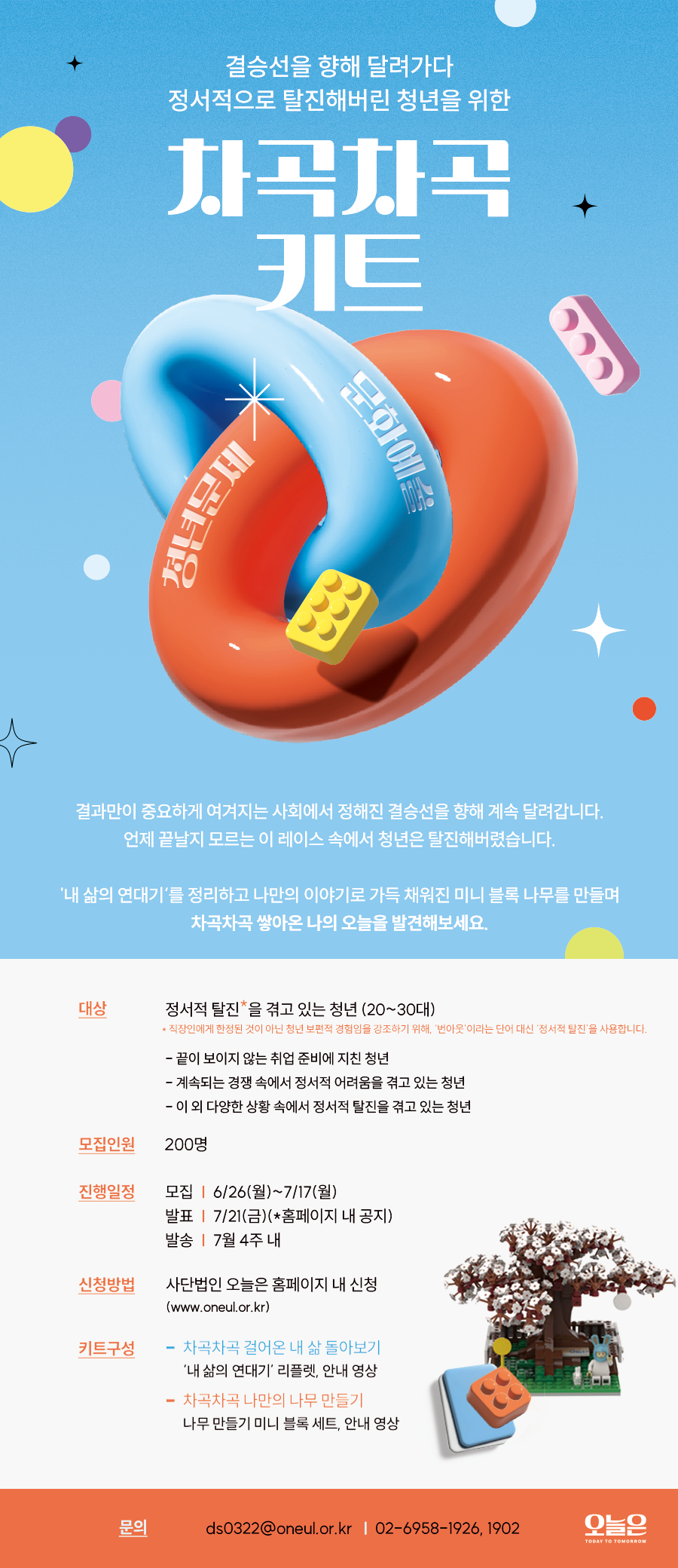 ✨ 모집인원 : 200명 ✨ 진행일정 : ✔ 모집 : 6/26(월)\~7/17(월) ✔ 발표 : 7/21(금)(*홈페이지 내 공지) ✔ 발송 : 7월 4주 내 ✨ 신청방법 : 사단법인 오늘은 홈페이지(www.oneul.or.kr) 내 신청 ✨ 키트구성 ✔ 차곡차곡 걸어온 내 삶 돌아보기 : ‘내 삶의 연대기’ 리플렛, 안내 영상 ✔ 차곡차곡 나만의 나무 만들기 : 나무 만들기 미니 블록 세트, 안내 영상 ✨ 문의 : ds0322@oneul.or.kr / 02-6958-1926, 1902