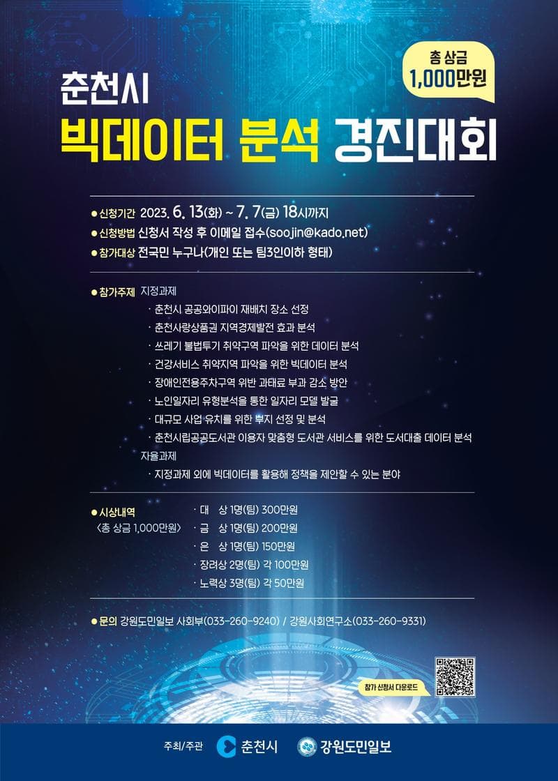 ○ 공모개요 강원도민일보가 춘천시와 함께 ‘2023 빅데이터 분석 경진대회’를 개최합니다. 전 국민(시민, 학생, 기업체 등)을 대상으로 춘천지역 공공부문 빅데이터 분석을 통해 공공부문의 현안을 해결하고 민간의 참신한 정책 아이디어를 발굴, 춘천시정에 반영하는 게 목적입니다. 데이터산업 선도도시 춘천의 초석이 될 이번 경진대회에 많은 관심 바랍니다.