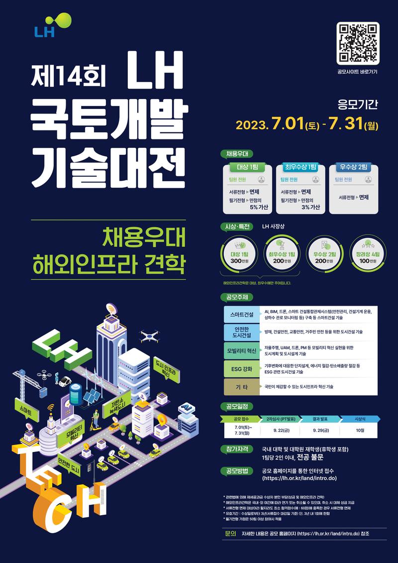 ○ 공모 주제 - 「국토·도시개발분야」의 스마트건설기술, 안전한 도시건설 기술, 모빌리티 혁신기술, ESG 건설기술 등 국민이 체감할 수 있는 도시인프라 혁신 기술 ○ 공모전 사이트 링크 - lh.or.kr/land/intro.do ○ 공모자격 - 국내·외 대학 및 대학원 재학생 (휴학생 포함), 전공 불문 - 1팀 2인 이내 (1인이 2개팀 이상의 공동응모 불가) ○ 공모전 마감일 - 기간 :2023. 07. 1 (토) 09 : 00 \~ 2023. 07. 31 (원) 18 : 00 까지 ○ 시상 내역 - 대상 1팀(300만원) - 최우수상 1팀(200만원) - 우수상 3팀(200만원) - 장려상 4팀(100만원) • 수상팀 전원 LH사장상(상패포함) • 우수상 이상 채용 우대 / 최우수 이상 해외 국토인프라 견학 ○ 공모 일정 1. 응모신청 - 기간 : 2023. 7. 1 (토) 09 : 00 \~2023. 07. 31 (월) 18 : 00 까지 2. 1차 심사 결과 발표 - 9월 중(홈페이지 공고 및 문자 발송) 3. 2차심사(PT발표/대면심사) - 9월 29일(예정) / 1차 합격자에 한해 장소 별도 안내 ○ 심사기준 및 방법 1. 사전 심사 : 공모제안서의 주제 적합성 및 과년도 중복 여부 등 판단 2. 1차 심사 : 공모제안서 심사로 고득점 순으로 20팀 선정 3. 2차 심사 : 제안자 PT발표(1차 심사를 통과한 제안)를 평가항목별 배점기준표에 따라 평가 시행(자세한 내용은 홈페이지 참조) ○ 제출/접수 방법 - LH 국토개발기술대전 사이트(lh.or.kr/land/intro.do)를 통한 인터넷 접수(방문, 우편접수 불가) ○ 유의사항 / 문의사항 - 기타 자세한 사항은 LH 국토개발기술대전 사이트(lh.or.kr/land/intro.do)에서 제공되는 참가안내서 참조