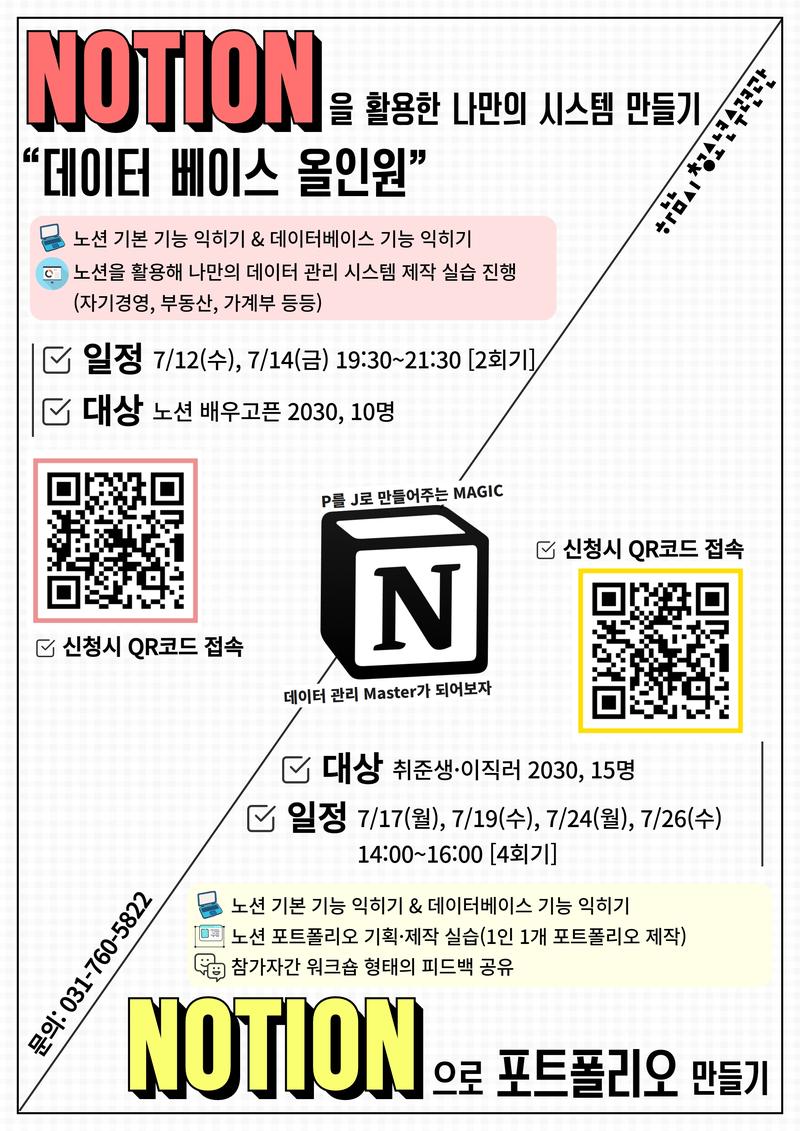 ■ 신청링크: https://naver.me/5vYLStG4 - 일정: 7월12일(수)\, 7월14일(금) 19:30\~21:30 [2회기] - 장소: 하남시청소년수련관 - 대상: 노션을 배우고픈 2030\, 총10명