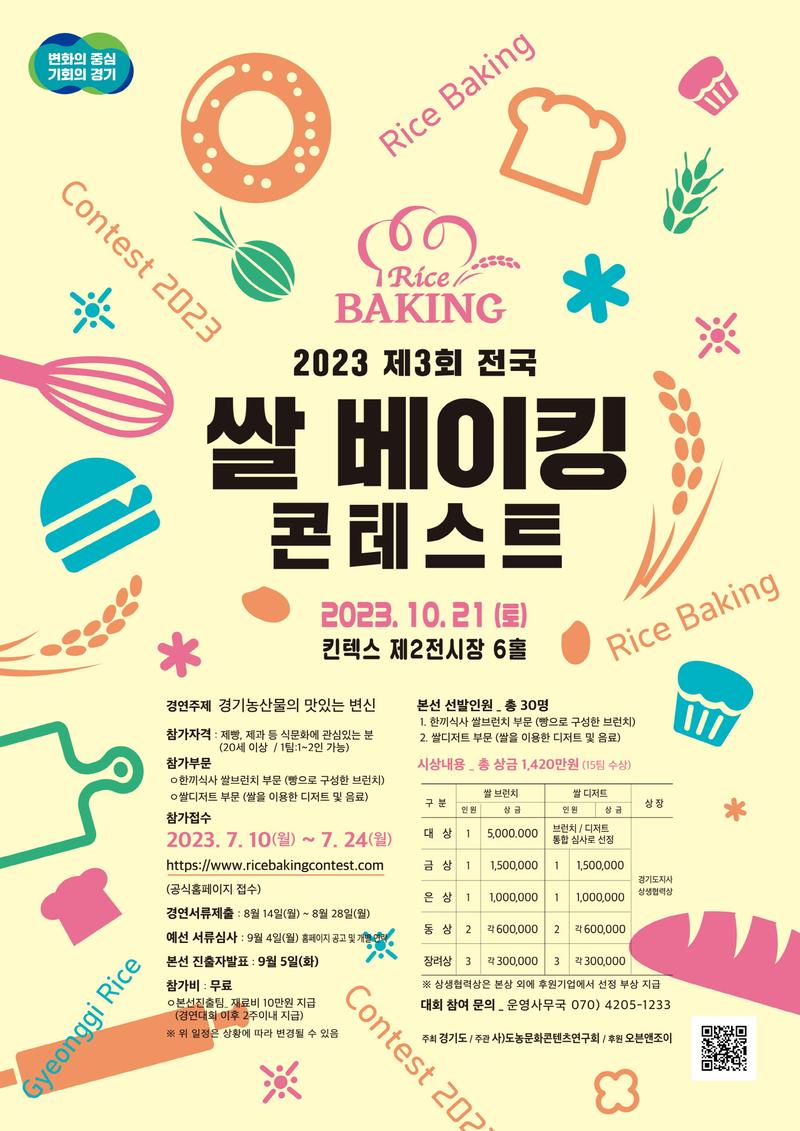 1) 신청접수 ○참가신청 : 7월 10일(월)\~7월 24일(월) ○참가신청용 쌀가루 배송 : 7월 27일(목) ○부대서류 제출 : 8월 14일(월)\~8월 28일(월) ○접수방법 : 홈페이지접수 www.ricebakingcontest.com ○참가부문 : - 한끼식사 쌀브런치 부문 (빵으로 구성한 브런치) - 쌀디저트 부문 (쌀을 이용한 디저트 및 음료) ○참가자격 : 20세 이상 음식 식문화 관심있는 학생 일반인 등 ※ 1팀 (1\~2명 참가 가능) ○제출서류 : ▫ 공통 - 참가신청시 [참가신청서,개인정보활용동의서,서약서] - 부대서류 [출품작품설명서 및 레시피(사진첨부)] ※ 쌀가루 : 참가자 신청자에게 쌀가루 4kg(기본:강력,박력분 각 1.5kg, 추가선택 1kg) 신청주소지로 배송 해당 쌀가루로 베이킹 준비 진행 (본선 당일 동일한 쌀가루 제공)